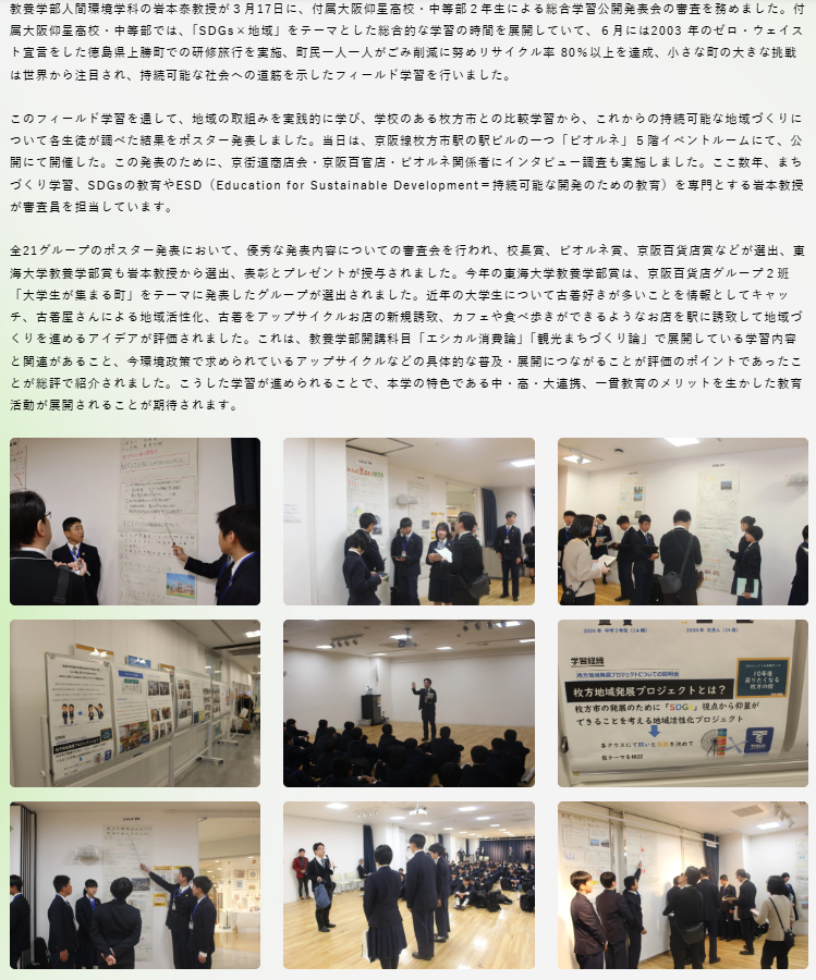 3月17日(月)に行われた、中等部2年生の「枚方地域発展プロジェクト ポスター発表会」の様子が東海大学(教養学部)のホームページに掲載されておりますので、是非ご覧ください。東海大学教養学部岩本教授より評価をいただいた内容が掲載されております。