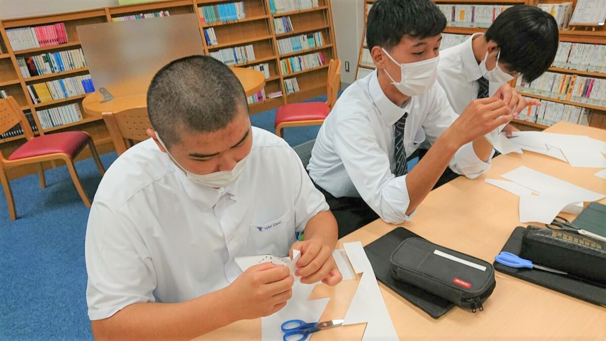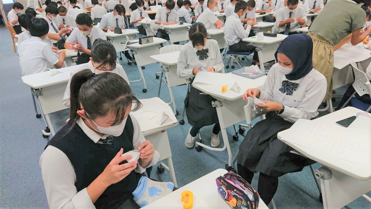 試行錯誤しながらも完成させる生徒が出てきました。完成した立体をみて、違う立体を完成させようとチャレンジする生徒も。生徒同士で相談しながら授業時間いっぱいまで完成させようと取組んでいました。留学生も一緒にチャレンジしてくれましたよ!