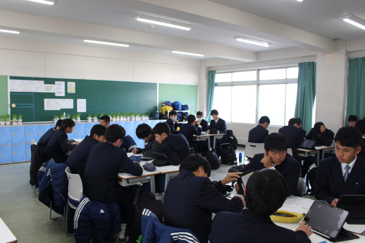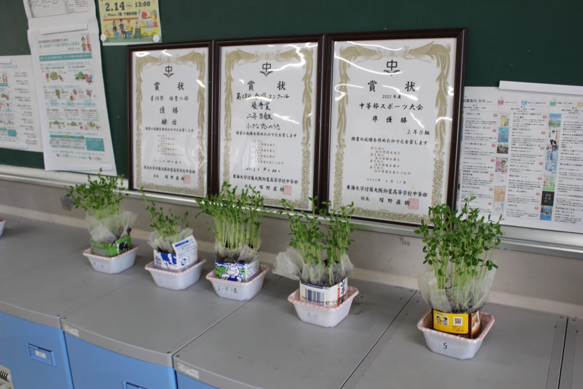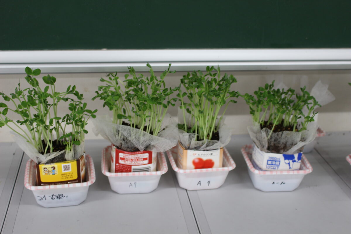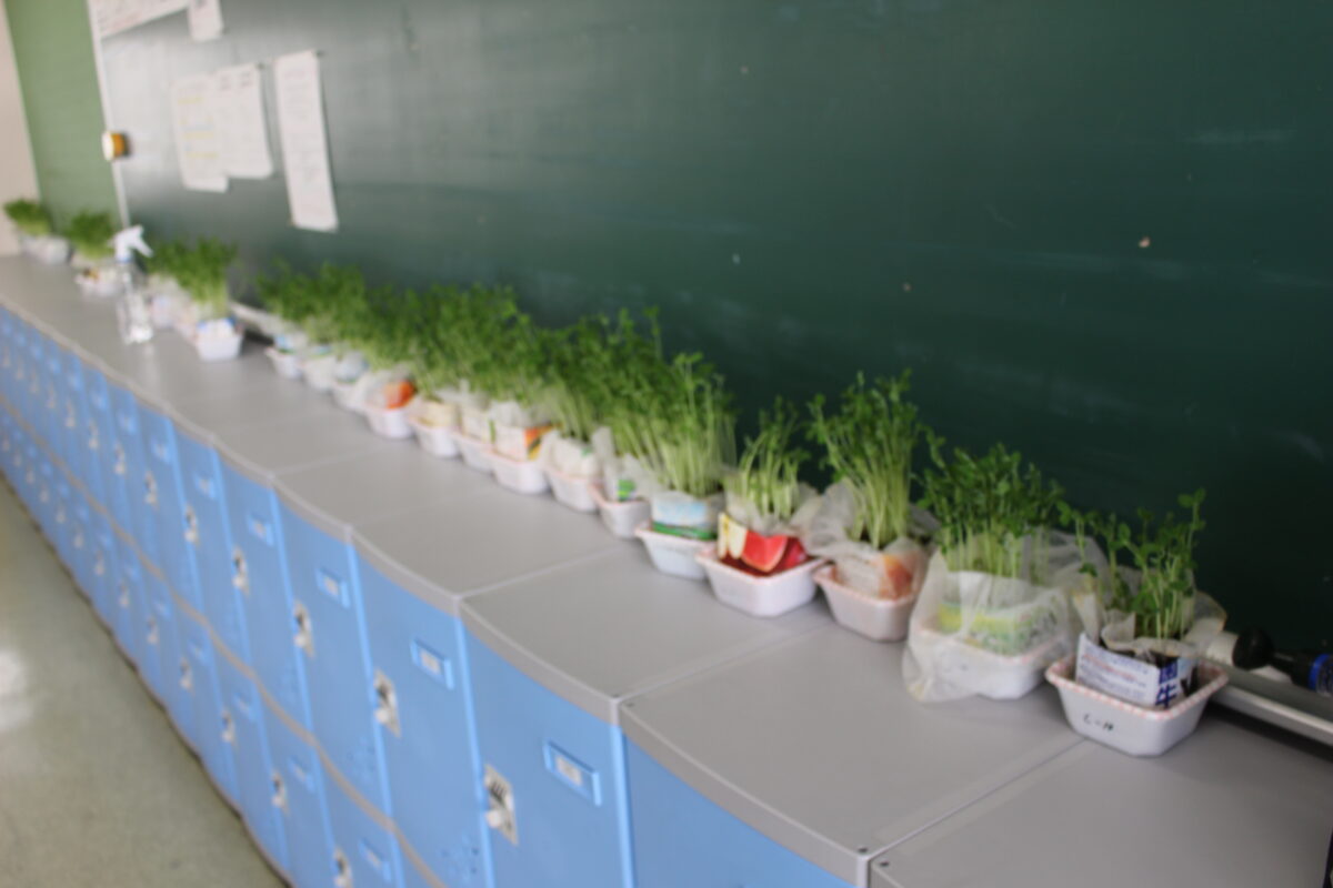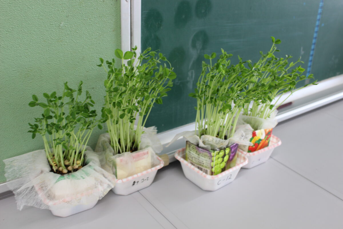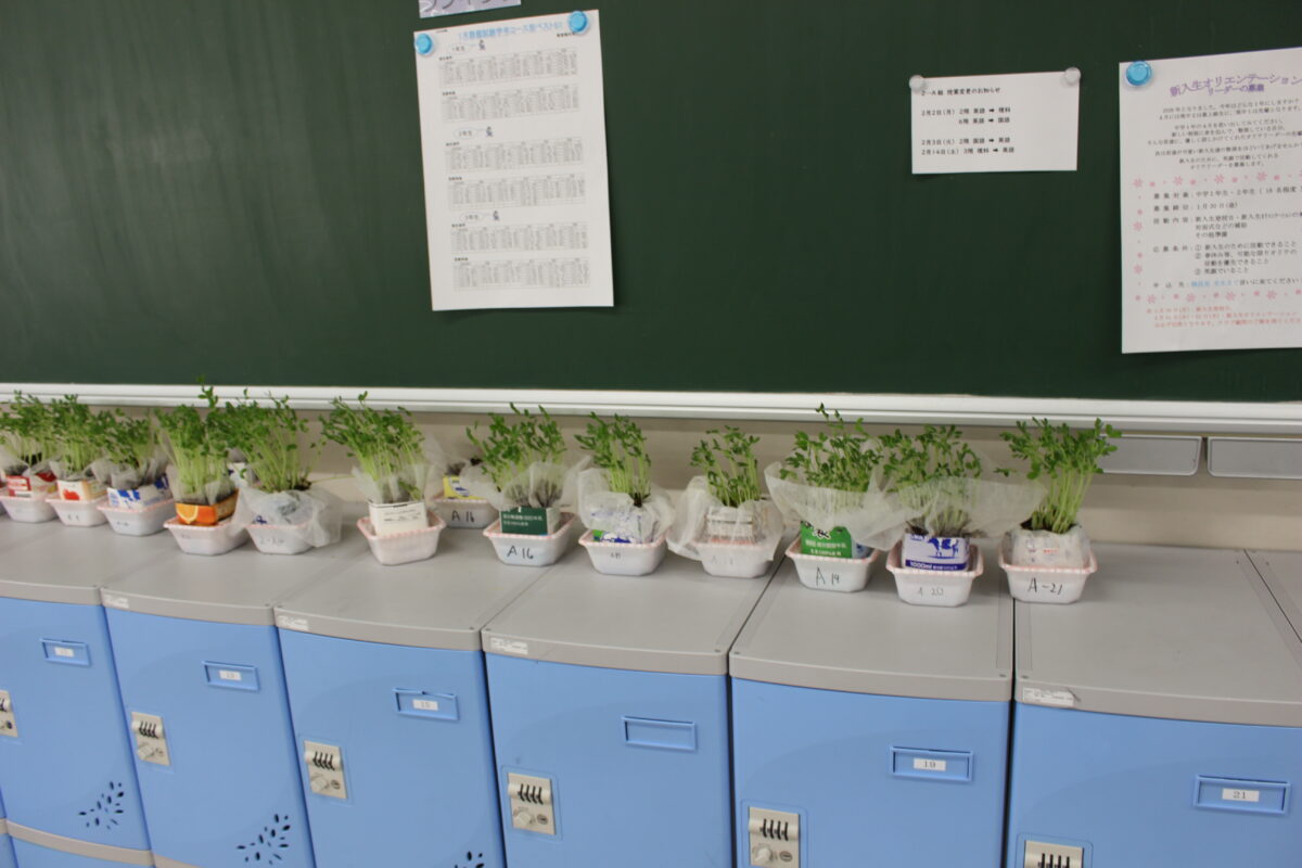 2年生の技術の授業の一環として「豆苗」の栽培を行っています。教室での栽培開始から約2週間を過ぎて、見事に食べ頃まで育ちました。水耕栽培のため、毎朝せっせと水を与えている姿は大変微笑ましかったですよ! さぁ、家に持って帰ってサラダを作りましょう! 無農薬だし、きっとおいしいですよ !