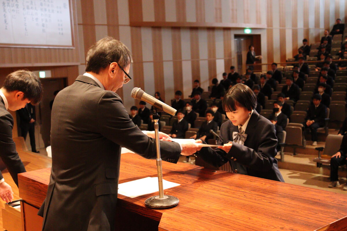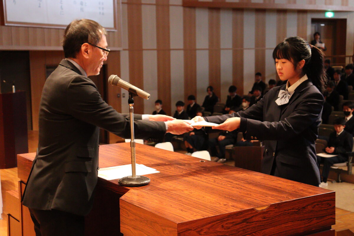 明日の卒業式を前に、これまでの努力を称える場として、各賞の表彰を行いました。また、漢字検定や英語検定などの合格者についても表彰を行い、日々の学習に真摯に取り組んできた生徒たちの成果が紹介されました。
