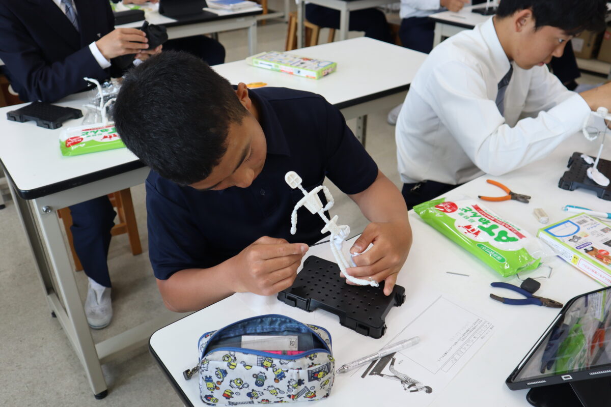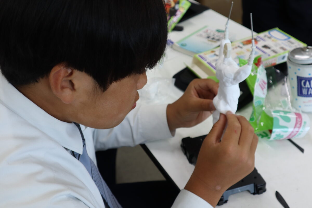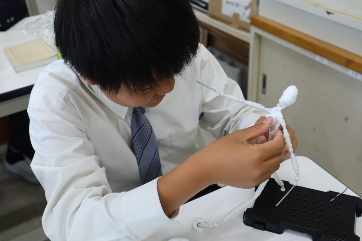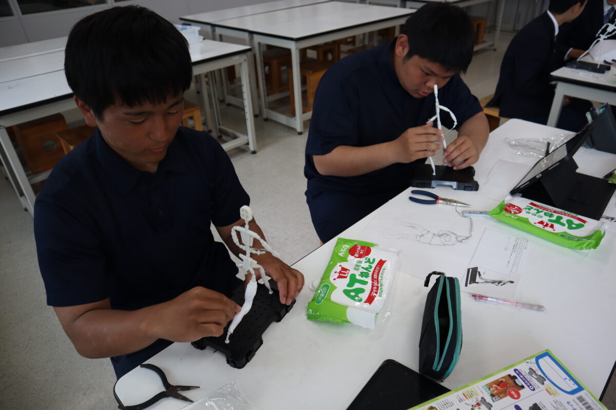 本日は2回目の授業となり、骨組みを完成させた後、紙粘土で体の基盤を作り上げている段階でした。クラブ活動中の自分の姿を表現している生徒が多く、それぞれが思い描く姿を形にしようと、真剣に制作に向き合っていました。