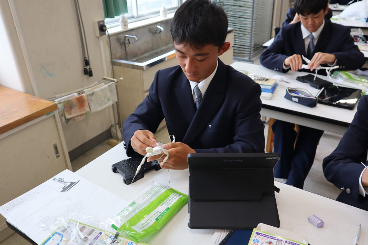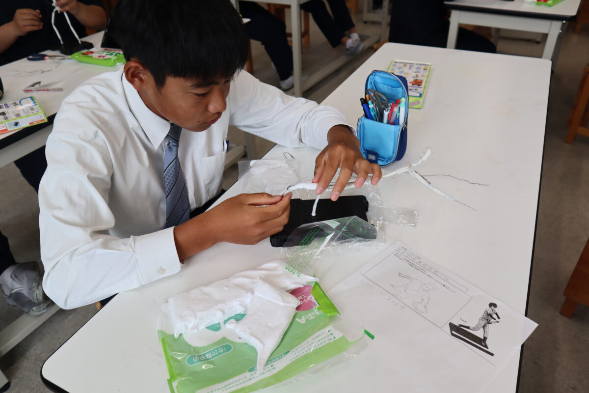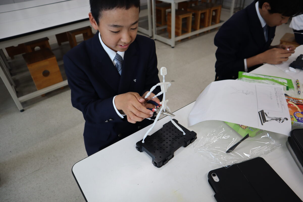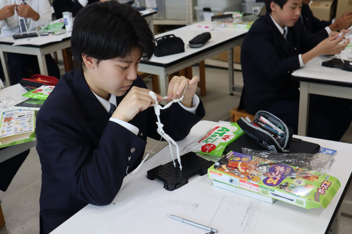 本日は2回目の授業となり、骨組みを完成させた後、紙粘土で体の基盤を作り上げている段階でした。クラブ活動中の自分の姿を表現している生徒が多く、それぞれが思い描く姿を形にしようと、真剣に制作に向き合っていました。