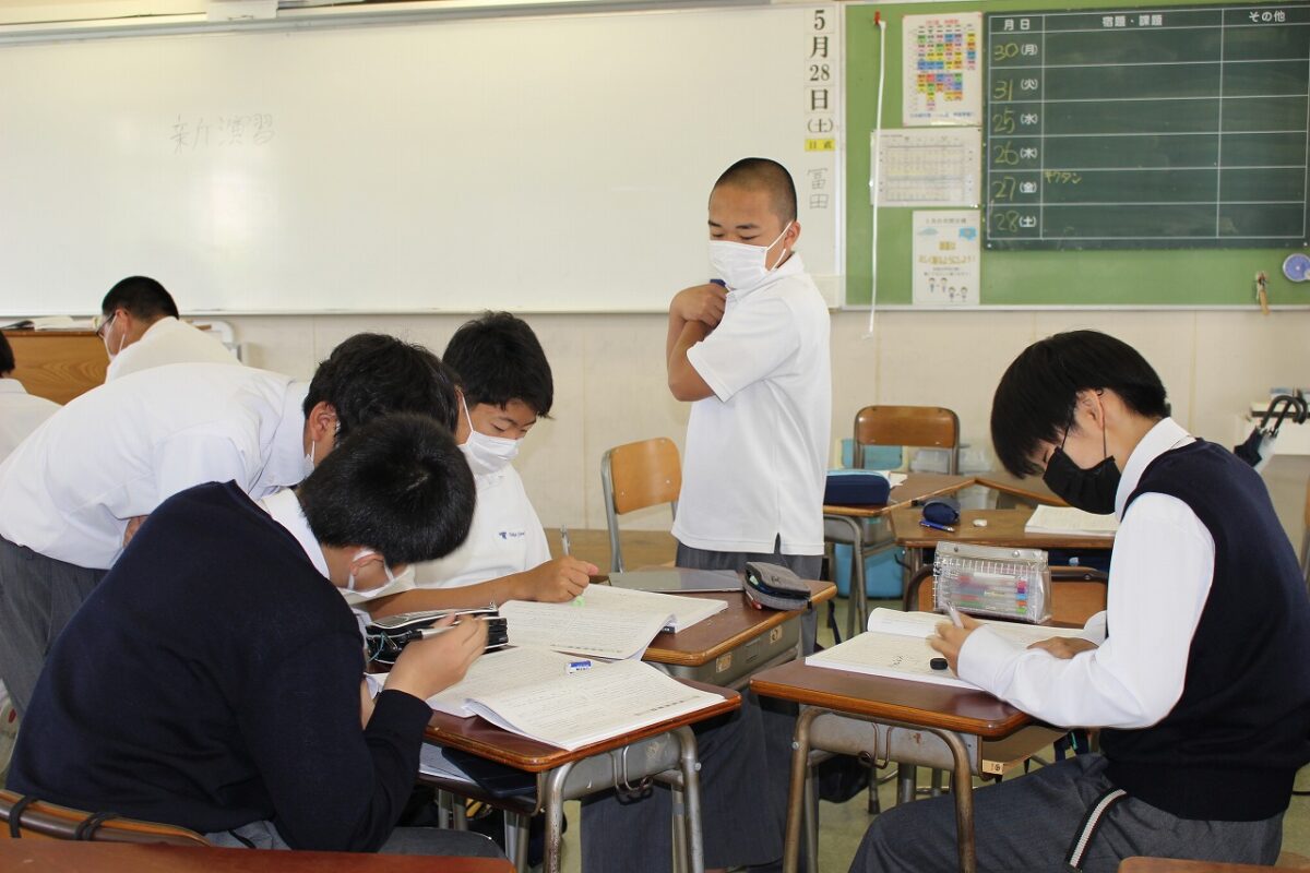 3-Cでは、クラスの半分程度の生徒が教室にいない中、グループで少し難しい国語の演習問題に挑戦しました。