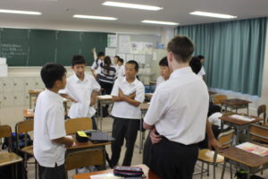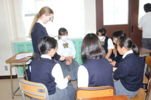 そのため英語TTの時間や総合学習の時間を利用して、英語での自己紹介や、日本の文化を相手に伝える練習を行っています。本校に来ている5人の留学生も一緒に手伝ってくれました。みんな楽しそうに取り組んでいましたが、マレーシアに行っても同じように対応できるようにがんばってほしいと思います。
