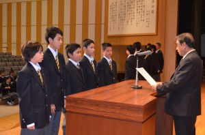 (右の写真は新入生代表あいさつの様子です)
