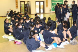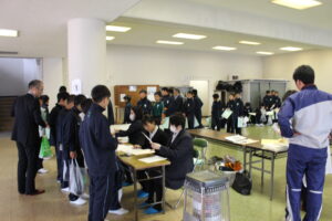 体育館の1階に集合、クラスごとに整列して受け付け開始です。