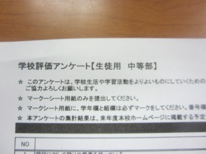今日は各HRで生徒対象のアンケートを行いました。 学校をより良い環境にするため、一生懸命に考えてくれていました。みなさん、ご協力ありがとうございました。(保護者の皆様方には、本日生徒を通じて資料を配布させております。)