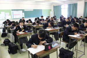1年C組では、3回目の数学の授業が行われました。今日はプリントを使用した演習問題を解き、先生にiPad内にあるアプリ「ロイロノート」を使って提出しました。