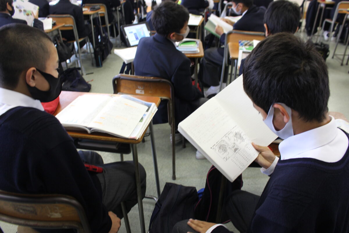 1年生の社会では、先生が黒板に書いたことをノートに書き写すのではなく、指定された単元の内容を自分で調べてノートをつくっています。ノートにまとめた内容は友達にプレゼンテーションし、お互いの理解を高めます。ノートがしっかりまとめられていないと相手に伝えきれないので、参考データやグラフなども加えながら解りやすいノート作りが必要です。また話を聞く力も養って、理解しようという意識も働きます。みんな積極的に学ぶ姿勢が身についてきている様子でした。今日ノートを見せてくれた生徒達のものは、どれもとてもわかりやすく素敵なノートに仕上がっていました!
