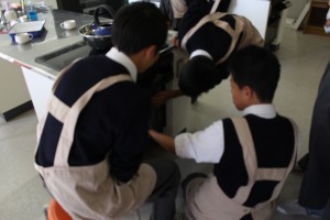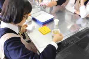 今日、家庭科教室の前を通ると、ほんのり甘いにおいがしました。どうやら2年生が調理実習を行っているようです。教室をのぞいて見ると、丁度シフォンケーキを焼き始めているところでした。女子はゼラチンゼリーを型に流し込み、グミを作っていました。こんがりとケーキが焼き上がると、「うまいー!」と声をあげ、みんなでおいしくいただきました。自分の家でも作れるようになればいいですね!