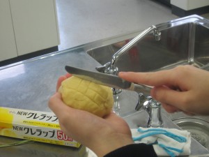 パンの生地を押したり、たたきつけたり、一生懸命10分間もこね続けました。
