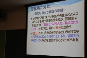 講座のテーマは「第二次性徴 変わっていくからだ」。思春期での体の発育にはどのような特徴や変化があるのかを知り、同時に大人になるという事は体だけでなく心の成長も必要であることを学びました。