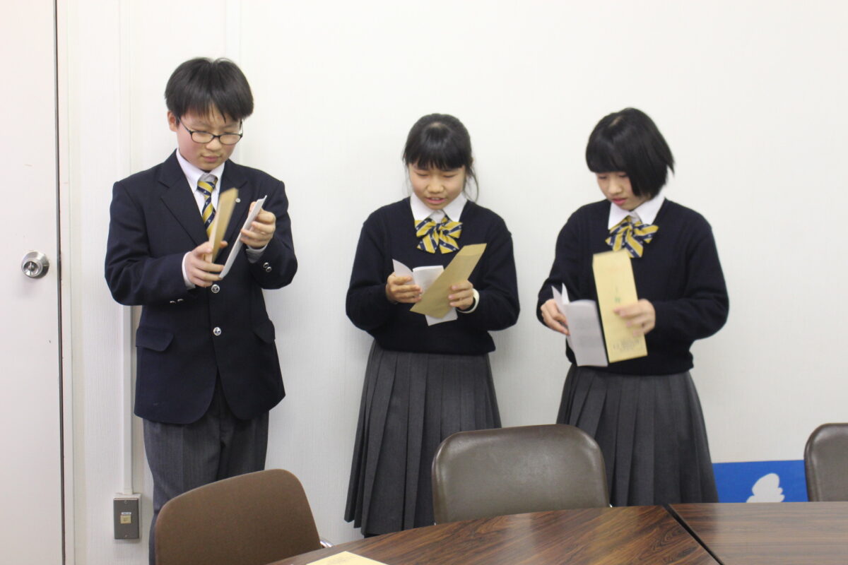 12月19日(木)に行われる合唱コンクールに向けて、お昼休みに各クラスの代表が集まり、各学年の発表の順番を決めました。 発表順の抽選が当日の順位を左右することはありませんが、みんなそわそわ、責任重大という感じです。みんな1番はあまり引きたくないようです。予備抽選から始まり、まるで野球のドラフト会議のような緊迫した雰囲気の中、抽選会が行われました。その結果、以下の順番になりましたのでお知らせいたします。なお、練習をしっかり重ねれば順番はあまり関係がないはずです。 クラス一致団結して合唱コンクールですばらしい歌声を披露してください!