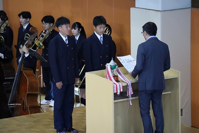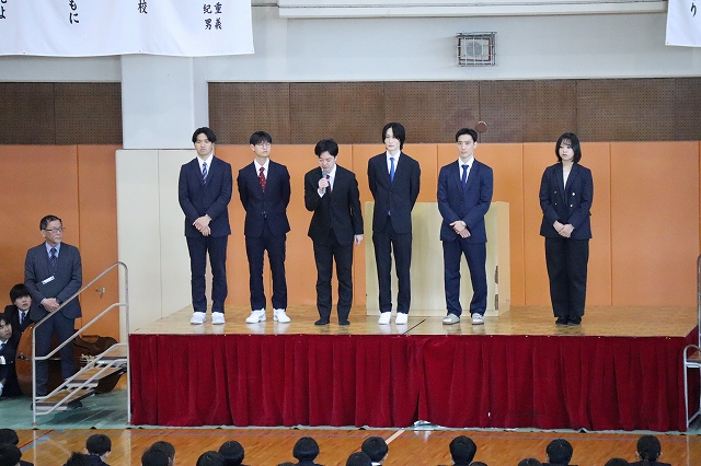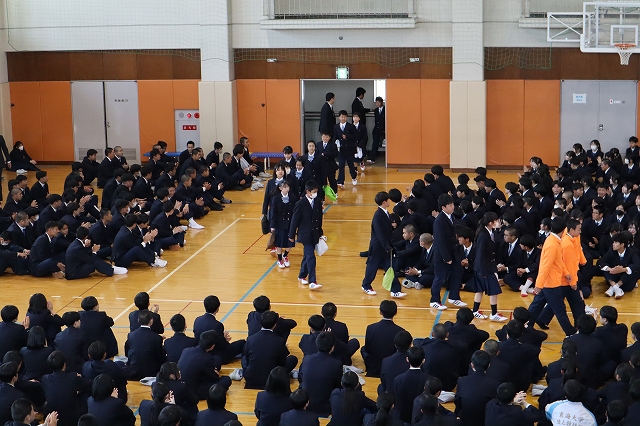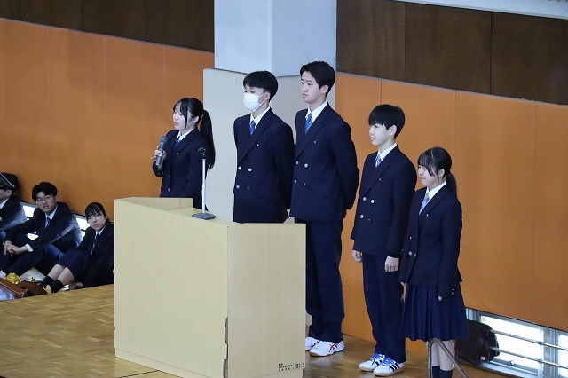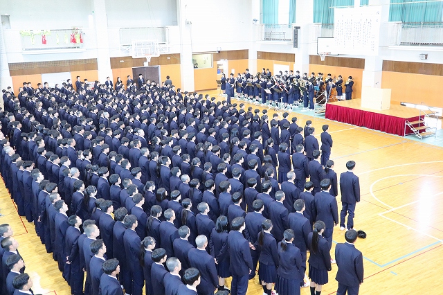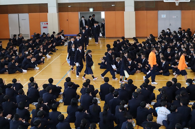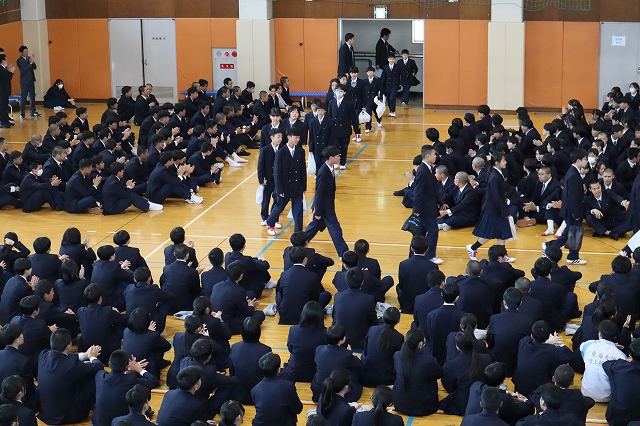 対面式では、体育館にて上級生が作った花道の中を新入生が入場し、大きな拍手に包まれながら新たな学校生活のスタートを迎えました。在校生を代表して生徒会長から歓迎の挨拶が送られ、新入生たちは緊張した表情を見せながらも、温かく迎えられたことへの嬉しさが感じられる様子でした。