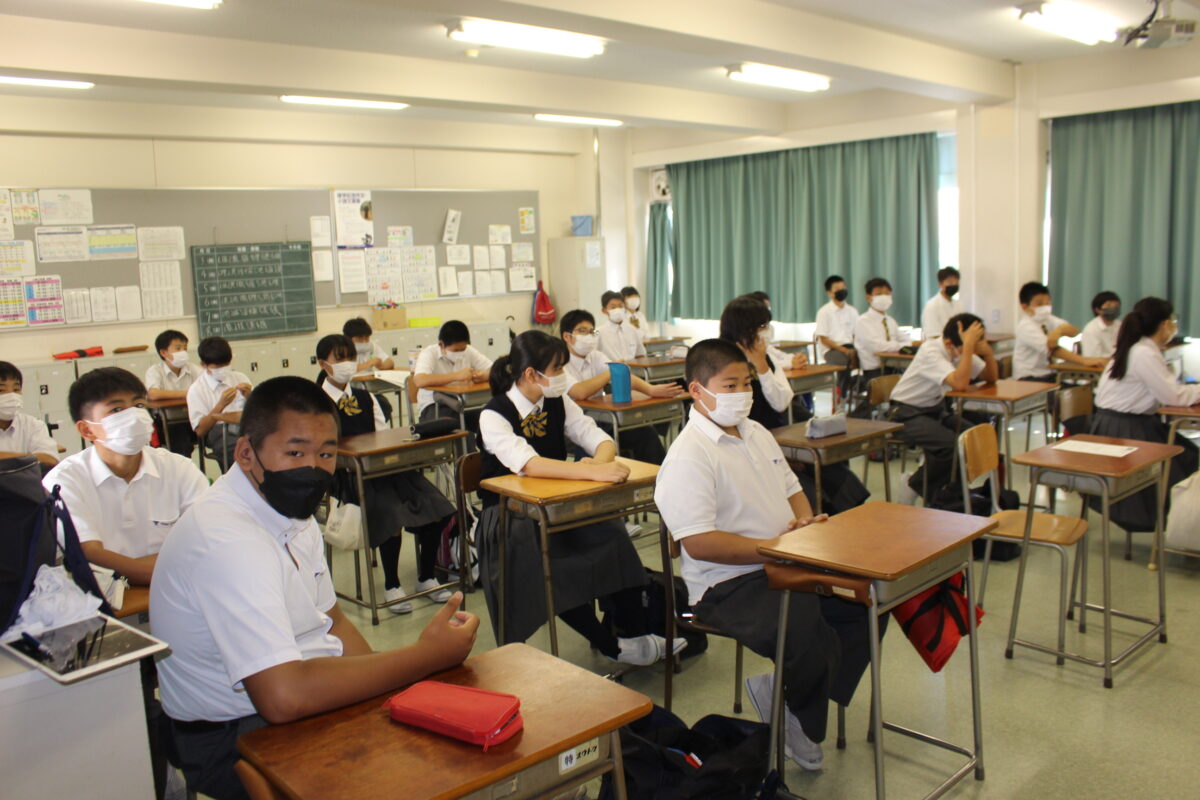 本校は2期制ということで、10月1日(金)より「後期」に入ります。そこで、朝のSHR後、校長先生より後期開始にあたり、全校放送でお話をいただきました。はじめに、「緊急事態宣言が解除されたとはいえ、未だ収束の域には達しておりません。感染予防対策について、一人ひとりその意識を緩めることなく、毎朝の検温・マスク着用、手洗い手指消毒、密を避ける工夫ある行動をとることを忘れないでください。また、昼食時等、友達の距離を近くして大声で騒ぐことないようにお願いいたします。」とのお話がありました。そして、この度のコロナ対策として、より万全な教育環境のも上、生徒のみなさんに安心して学校生活を送って欲しいという願いのもと、保護者の皆様より、学校に以下の品物を支援していただいたことの報告がありました。