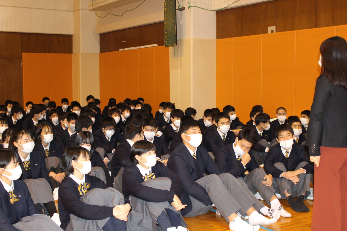 校長先生からは、今年の「箱根駅伝」で総合優勝を果たした青山学院大学の主将の「全員が自分の力を発揮してくれて、『総合力』で優勝することができました」というレース後のコメントが紹介され、一人一人が自分の力を発揮してこそ成せる「総合力」は、「チーム仰星」にも当てはめることができるのではないかというお話がありました。また、今日はラグビーの全国大会の決勝であるため、生徒・教職員・保護者の皆さま・卒業生・地域の方々の「総合力」で応援し、4年ぶり6回目の全国優勝を果たしてもらいたいというお話もありました。