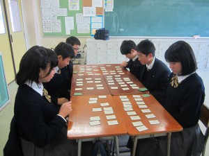 新年早々に、全学年で競い合う、「百人一首大会」が行われます。国語の授業の一環で行われ、和歌の暗記テストも同時に行ないます。今日は2年生の授業を見学してきました。やっぱりテキストを使って覚えるより、実戦が大好きなようです。 みんな本気になるのでとても楽しいですね!