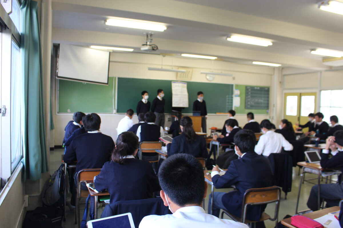 社長・財務担当・広報担当・社会貢献担当と役割を分担し、各企業がクラスの仲間たちから投資をしてもらう想定でプレゼンを行っていきました。それぞれ今の世の中にとって何が必要なのかをよく考えて事業プランを考えてくれていました。着眼点がおもしろい企業、問題の解決方法がおもしろい企業、発表方法がおもしろい企業など、各企業の特色が出て充実のプレゼン大会になりました。