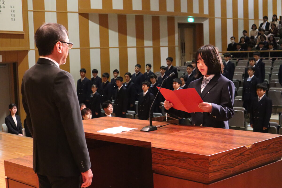 式では、建学の歌や校歌をしっかりとした声で斉唱し、入学呼名でも一人ひとりが大きな声で返事をする姿が印象的でした。新たな学校生活への意欲が感じられる、頼もしいスタートとなりました。 また、校長からの式辞に加え、保護者会会長からも温かいお言葉をいただき、新入生たちはあらためて仰星の一員となったことを実感している様子でした。これから始まる学校生活の中で、多くの出会いや経験を重ねながら成長してくれることを期待しています。