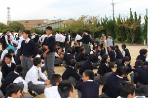 今回の訓練では、化学教室での火災発生を想定し、生徒達は決められた避難経路に従って陸上競技場に避難しました。