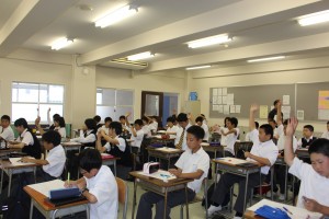 <1年生> 1年生の教室では、担任の先生が、学校でよく起こり得る問題事例を4つあげ、それらを「いじめ」と捉えるか否かを生徒達に問いかけていました。 ケースの全てが、生徒達の身近な問題だったので、みんな真剣にワークシートに向かっていました。 意見発表では、「いじめ」の捉え方の違いが明らかになり、改めて「いじめ」の定義を共有し、「いじめ」を許さないクラスを作っていくことを確認しました。