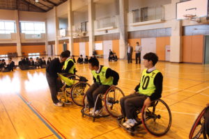 先生や生徒たちも実際に車椅子バスケットを体験しました。とても楽しかったと好評でした。