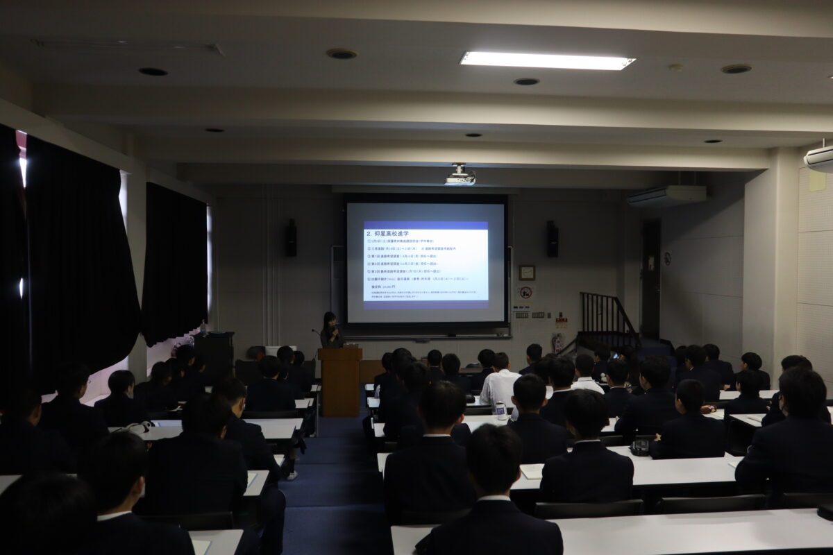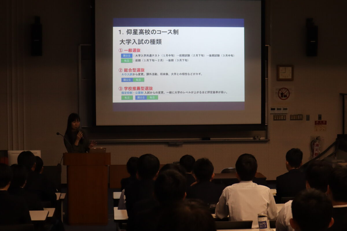 仰星高校への進学にあたり、各コースの特徴や大学入試の形態について、教務主任より詳しい説明がありました。