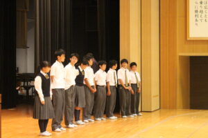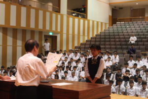 6月の朝礼を行いました。内容は、写生大会の作品表彰と生徒主任講話でした。