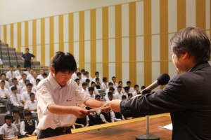 6月の朝礼を行いました。内容は、写生大会の表彰といよいよ始まる研修旅行についてのお話でした。写生大会の入賞者には校長先生より、一人一人に賞状が手渡されました。また、メディアセンターに作品が展示されましたので、ご覧ください! 研修旅行については、生徒主任の先生より「思いやりのある言動や行動をこころがけること」、「先生の指示を聞き逃さず、ルールーやマナーをしっかり守ること」とのお話がありました。「思いやり」は、相手の立場や気持ちを理解することが必要です。また、研修旅行先では人だけでなく、自然や動物なども大切にできる態度を養ってほしいと思います。ルールーやマナーについては、国や地域によってルールやマナーが異なる場合がありますので、自分本意の考えにならないように注意してほしいと思います。