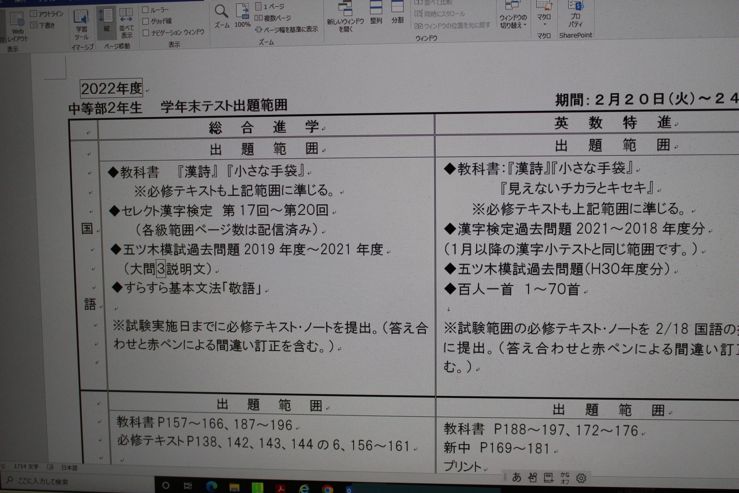 学年末試験の「出題範囲」が提示されました。
