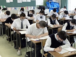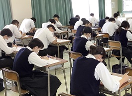 本日は、前期中間試験の最終日でした。5月21日(金)に予定されていた試験が大雨・洪水警報による休校となったために、本日に延期されての実施となりました。高校3年生は全クラスが2科目の受験でした。いずれのクラスでも勉強の成果を発揮しようと一所懸命に問題に取り組む姿はまさに「静かなる闘い」でした。