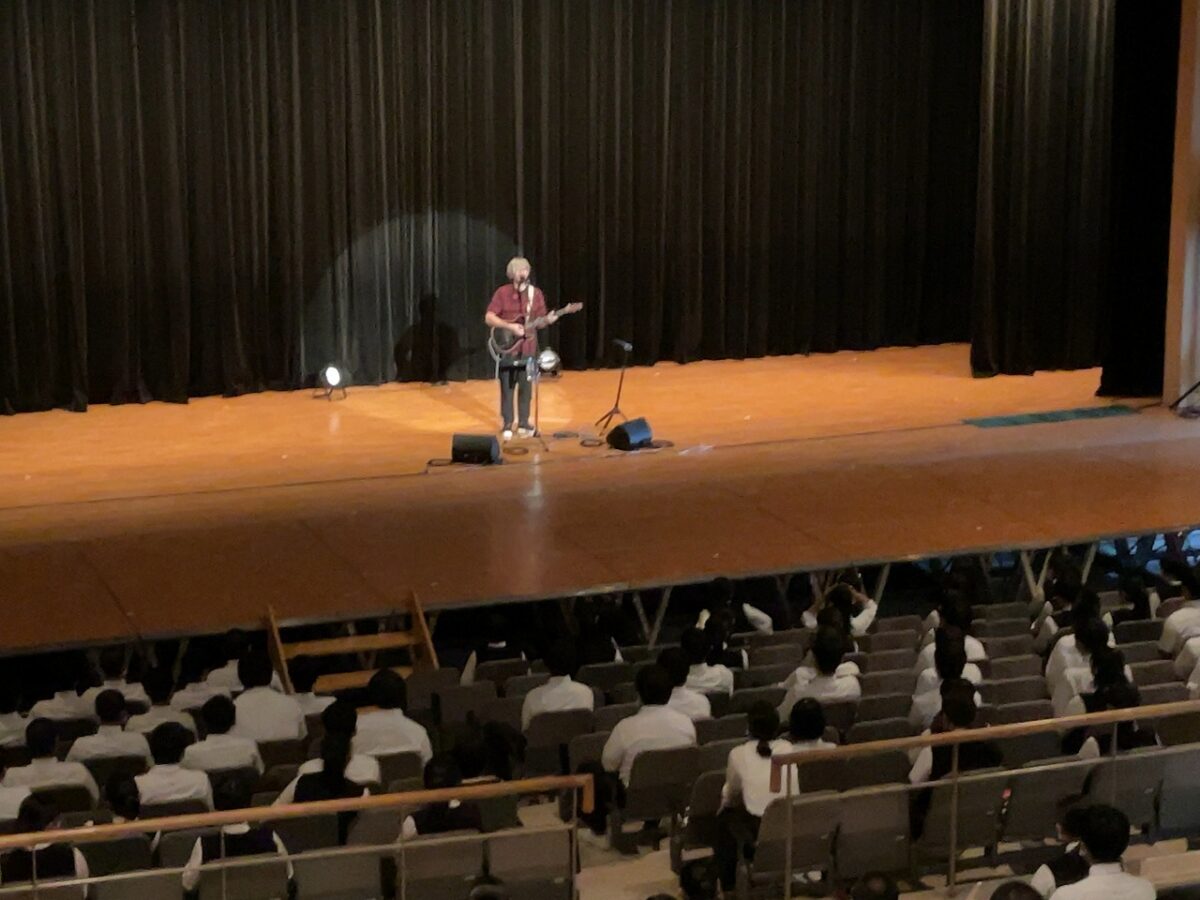 今日は、染谷西郷さんにお話しをしていただきました。染谷さんはFUNKISTのボーカルをされています。ご自身のルーツである南アフリカのことや学生時代のこと、音楽のこと、さらにサッカーワールドカップのことなどご自身の体験されたことを、音楽を交えながら、お話いただきました。その1つ1つのエピソードの中に染谷さんの思いやメッセージが込められており、言葉と音楽が心に突き刺さったのではないかと思います。今日の講演を聞いて、勇気付けられた、一歩踏み出そうと思った、あきらめずに頑張ろうと思ったなど、いろいろな思いを心に宿したのではないかと思います。染谷さんは「夢を叶えた奴に諦めた奴はいない、諦めない奴だけが夢をかなえられる」とおっしゃっていました。これからの高校生活だけでなく、その後につづく人生において何か背中を押してもらえた講演会でした。
