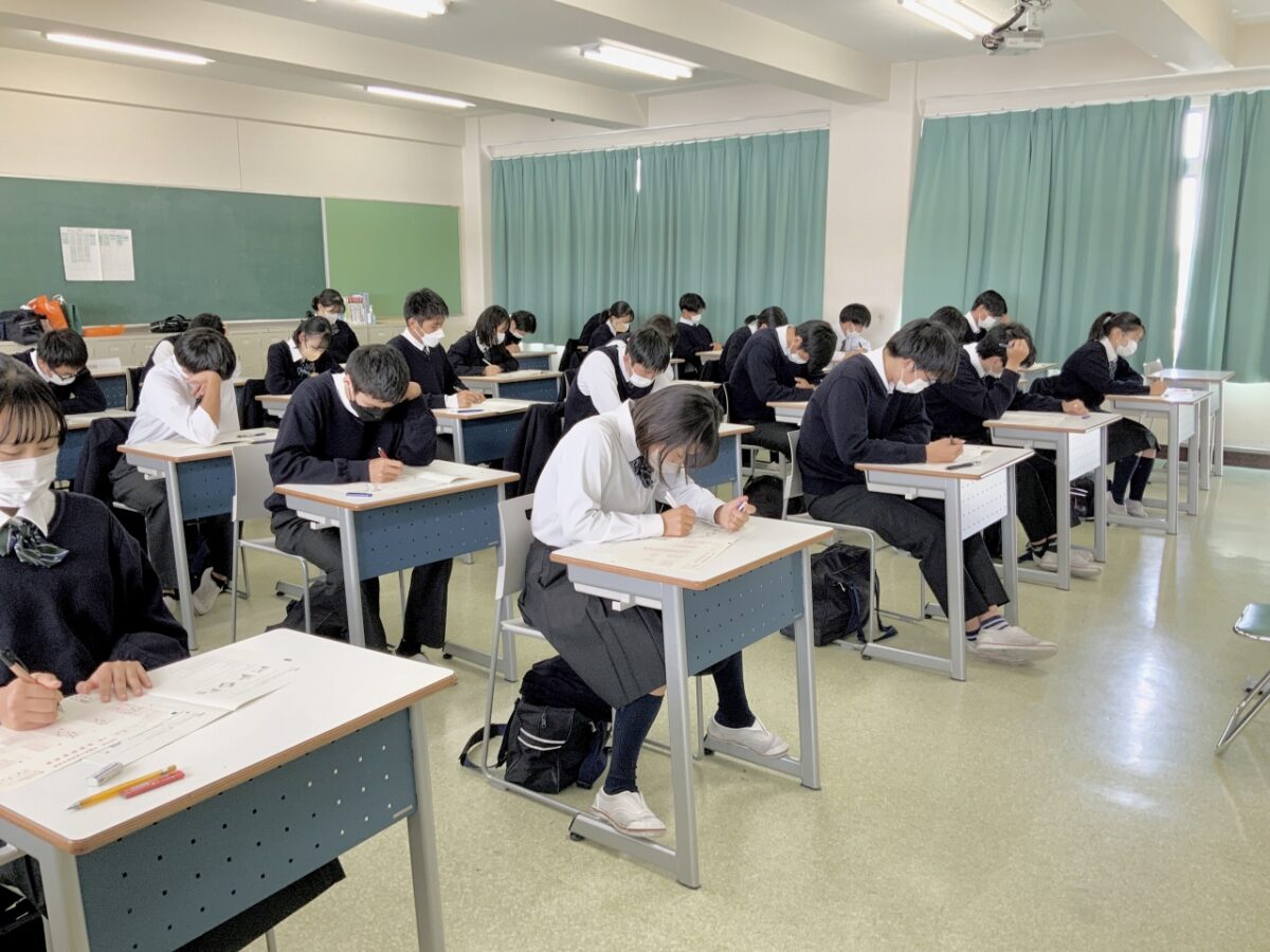 お邪魔した2年生の教室では、昨日の進研模試の自己採点に取り組む姿や小テストの勉強に取り組む姿が見られます。授業が進んでいる教室では真剣な眼差しが・・・これまで先輩の姿を見て、たくさんのヒントを貰ってきたはずです。2年生には「まだまだ時間はある!」でも、今ある時間を精一杯活用する姿勢は大切にしていきましょう!