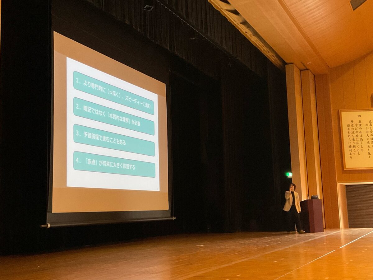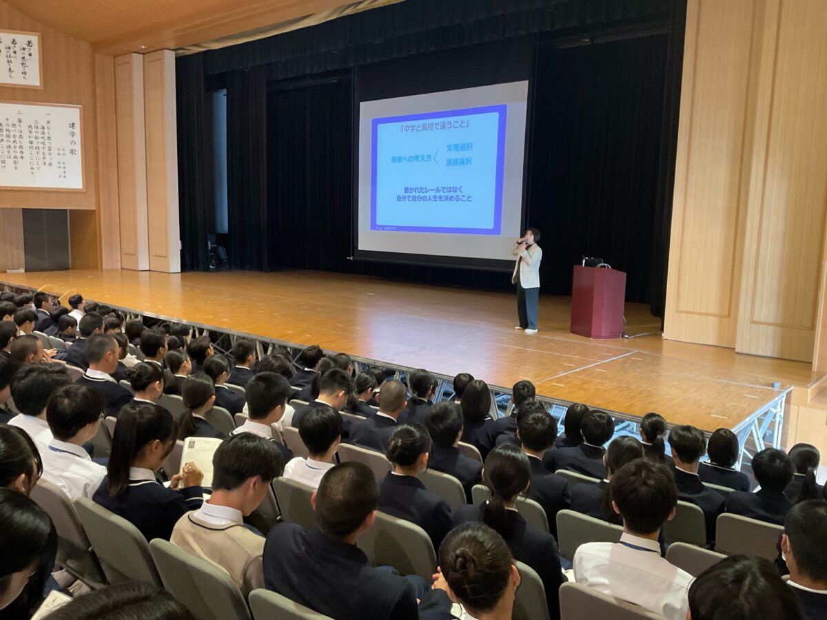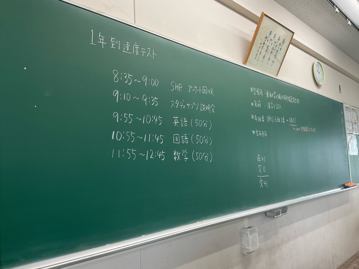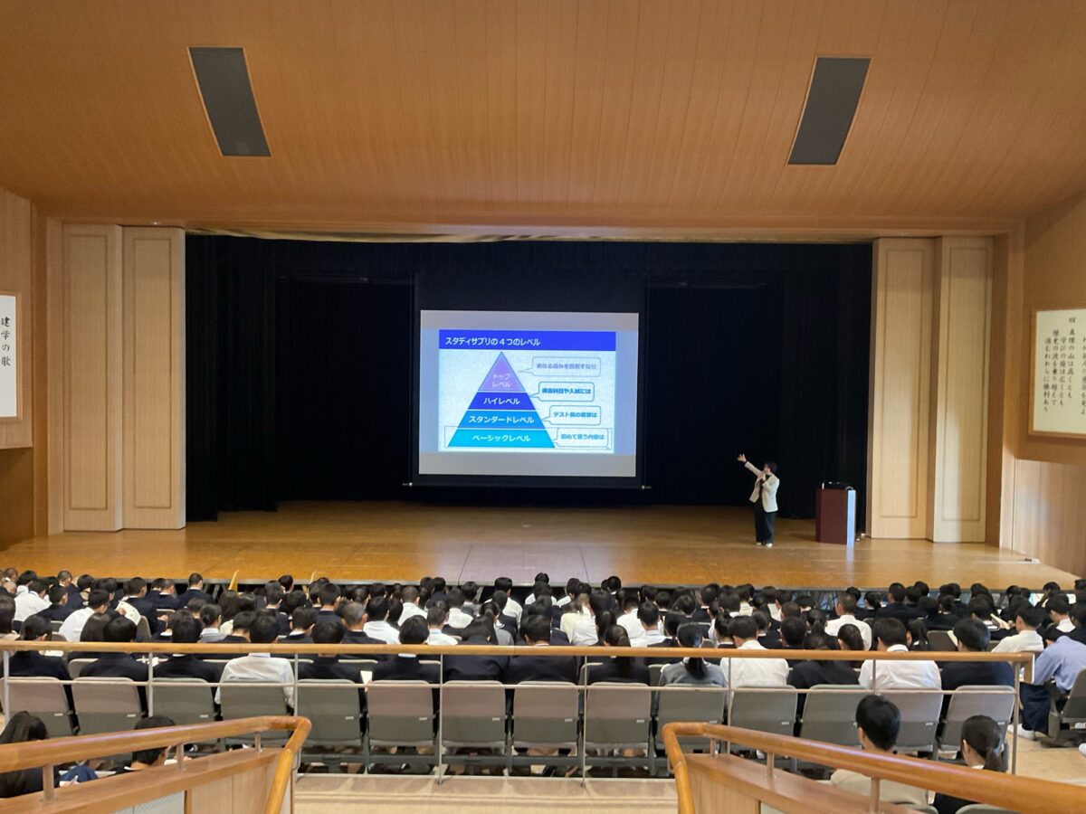 到達度試験は、現在の学力を把握し、今後の学習につなげていくための大切な機会です。試験に先立ち、リクルートより講師の方をお招きし、中学校と高校の学びの違いや、「スタディサプリ」の効果的な活用方法についてご講話いただきました。生徒たちは真剣に耳を傾け、メモを取りながら、これからの学習に向けた意識を高めている様子が見られました。