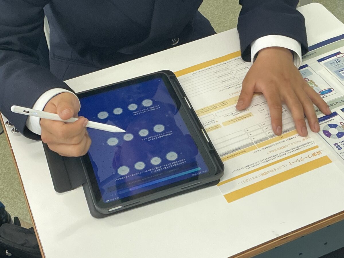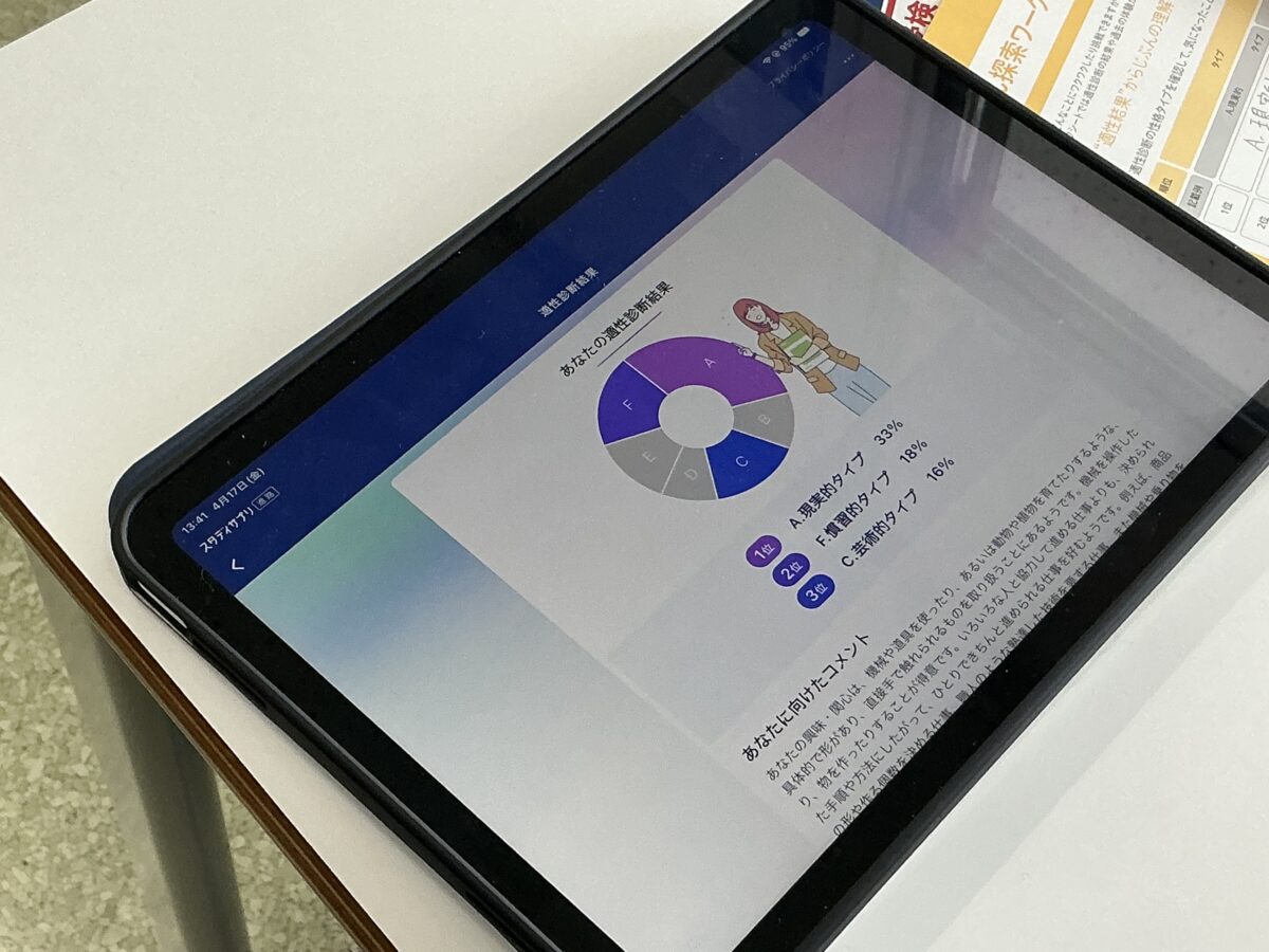 午後からは、iPadを活用して適性適職診断を行いました。診断では、自身の考え方の傾向や興味関心、文系・理系の適性、さらには将来の職業においてどのような強みを生かせるかなどが多角的に分析されました。生徒たちは興味深そうに取り組み、一人で集中して進める姿や、友人と結果を共有しながら取り組む姿など、それぞれの個性が表れる時間となりました。