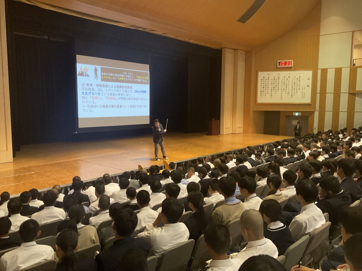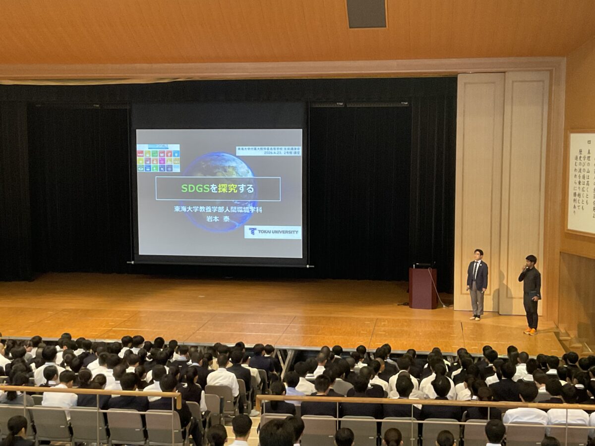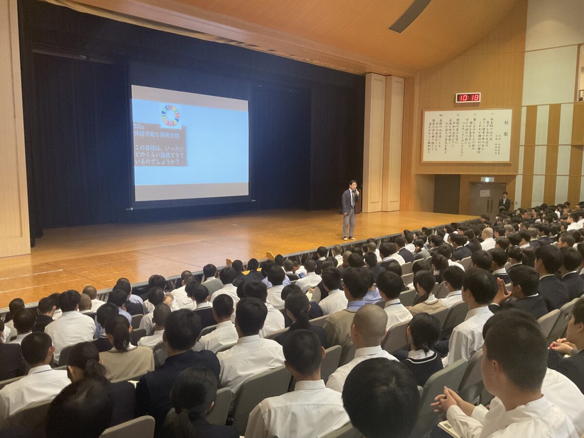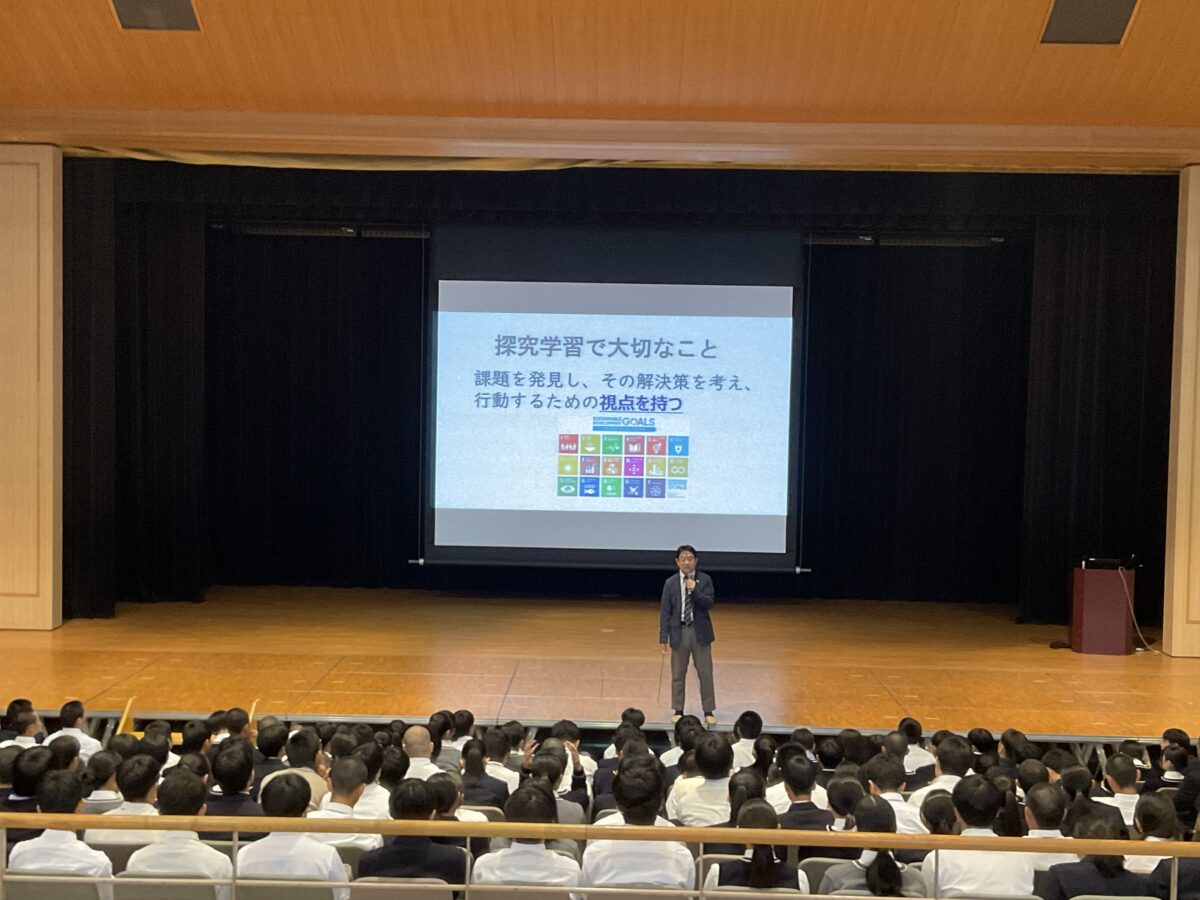 2時間目はSDGs講演会として、東海大学より岩本泰教授をお招きし、ご講話いただきました。「SDGs」という言葉について分かりやすく解説していただくとともに、課題解決に向けて考えることが、アイデア力や行動力の育成につながる点について、「探究学習」と関連づけてお話しくださいました。
