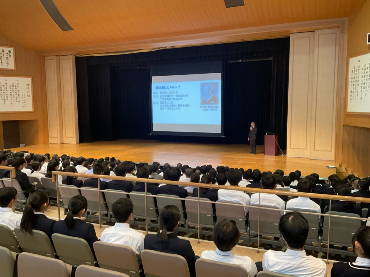 1時間目は、校長先生による「現代文明論」の講話がありました。現代文明論とは、「人生をいかに生きるべきか」と自らに問いかけ、意義ある人生を送るために、多様な視点の中から正しいものの見方・考え方を確立し、人道主義・人格主義に基づいた思想を培うことを目的とした、学園独自の中核的な教育です。東海大学における「現代文明論」は、創立者である松前重義が戦後、新制東海大学で「電気概論」の講義の中で自身の考えを語り始めたことをきっかけに誕生し、その後、独立した科目として体系化されました。本日は、東海大学の成り立ちや本校の歴史について詳しくお話しいただきました。