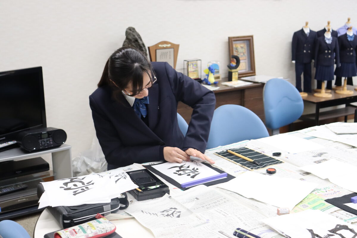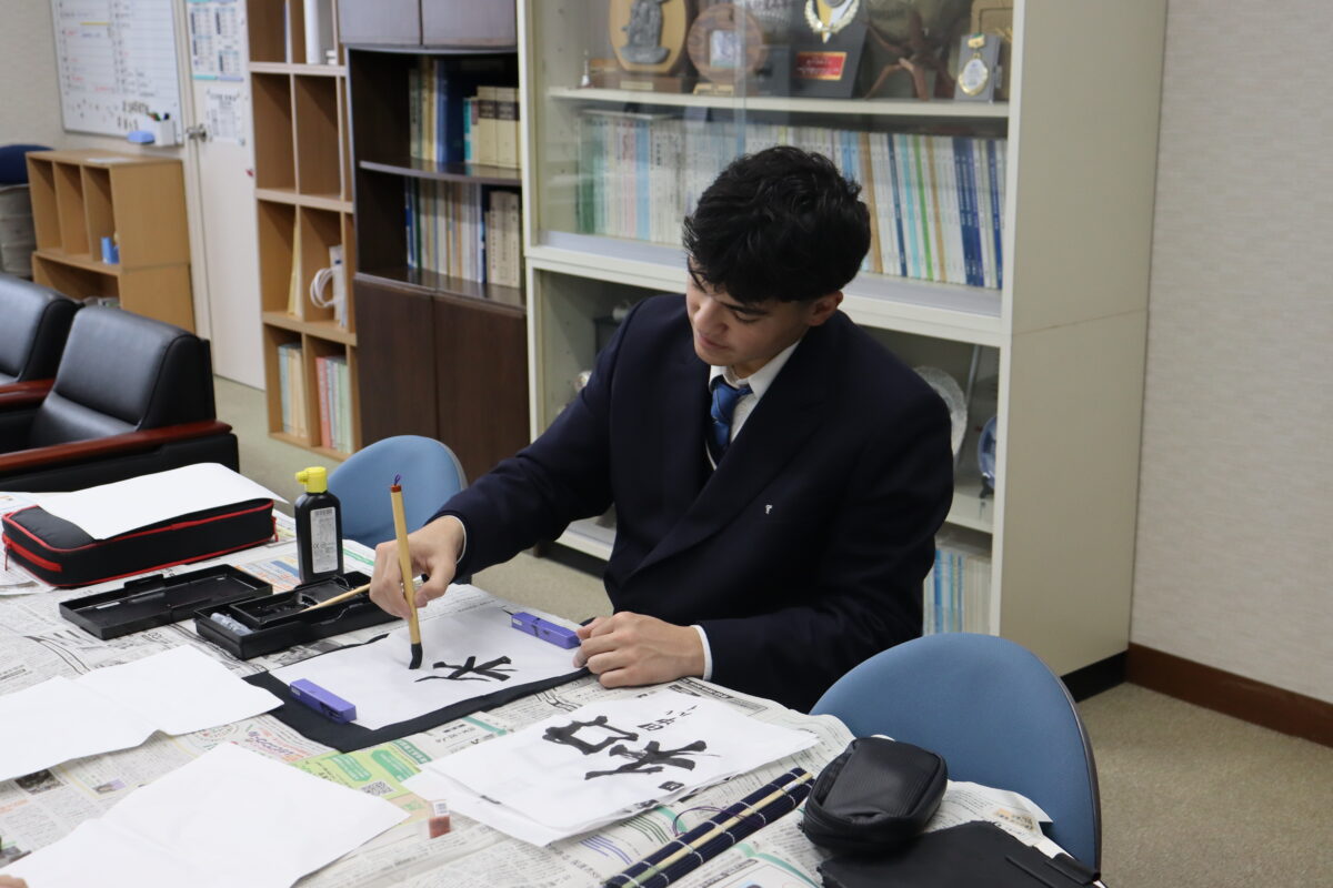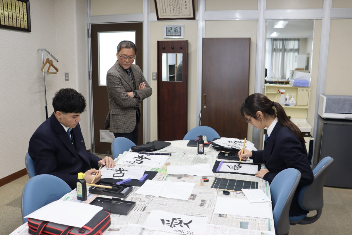 現在、本校には2名の留学生が来日して学んでいます。その留学生たちに日本の正月文化を身近に感じてもらおうと、書き初めを体験をしてもらいました。参加留学生は、好きな漢字を選ぶと慣れない筆を握り自由に書くことに挑戦しました。体験後には「書道に挑戦することは初めてではないが、やっぱり難しかった。」、「難しさはあるけど楽しかった。」という声が聞かれました。日本の文化を学ぶことができ、留学生にとっては貴重な経験になったようです。