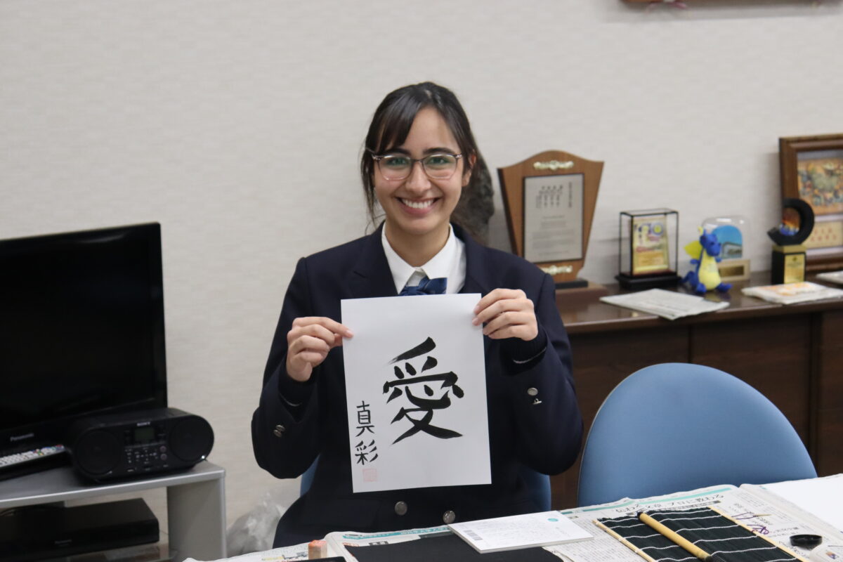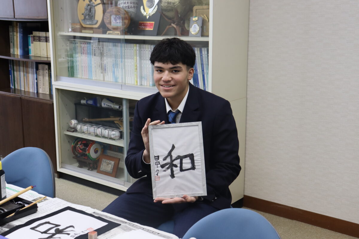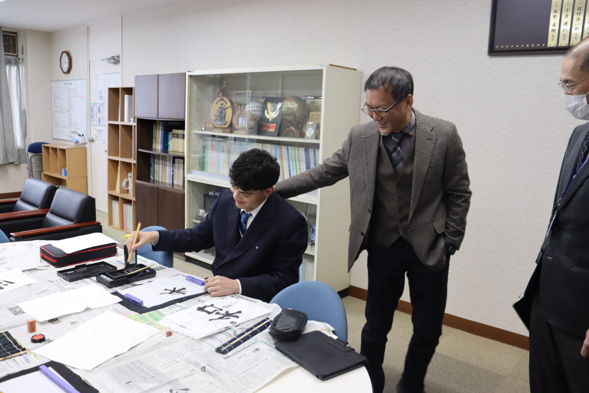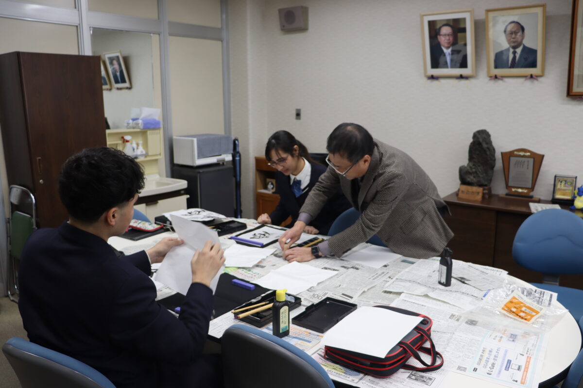 現在、本校には2名の留学生が来日して学んでいます。その留学生たちに日本の正月文化を身近に感じてもらおうと、書き初めを体験をしてもらいました。参加留学生は、好きな漢字を選ぶと慣れない筆を握り自由に書くことに挑戦しました。体験後には「書道に挑戦することは初めてではないが、やっぱり難しかった。」、「難しさはあるけど楽しかった。」という声が聞かれました。日本の文化を学ぶことができ、留学生にとっては貴重な経験になったようです。