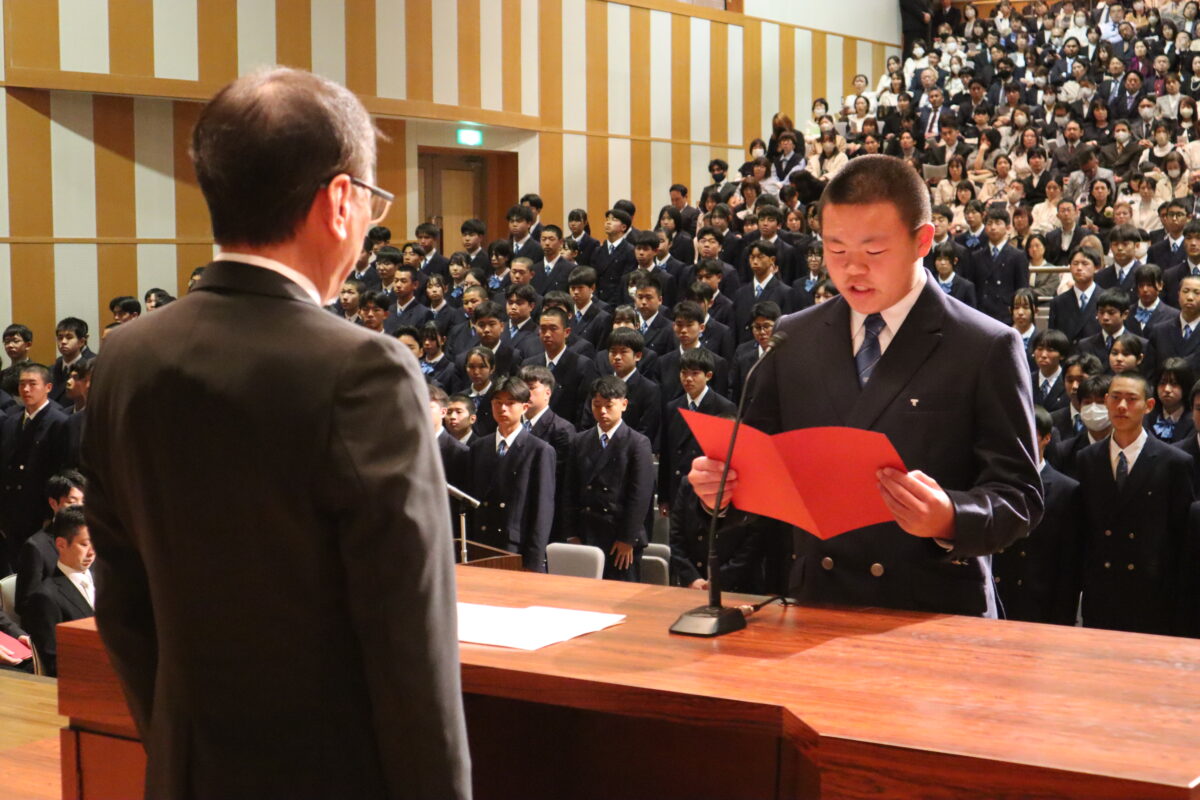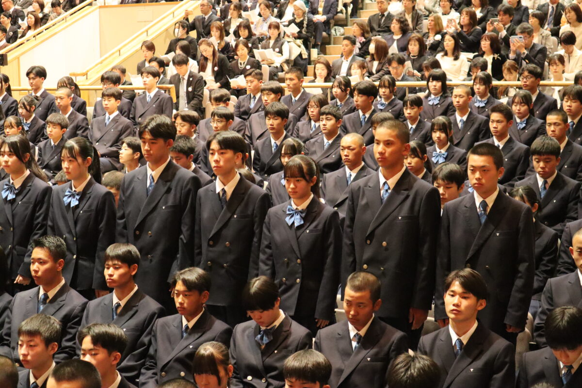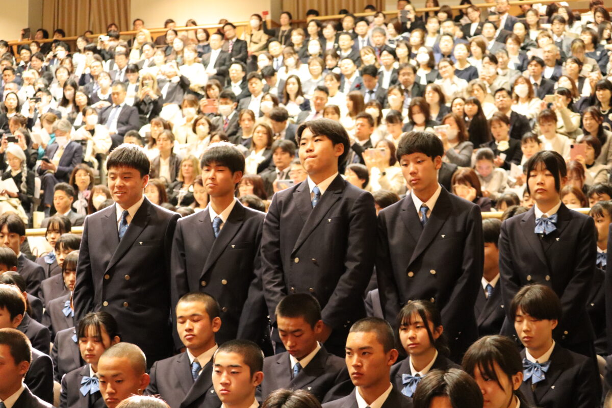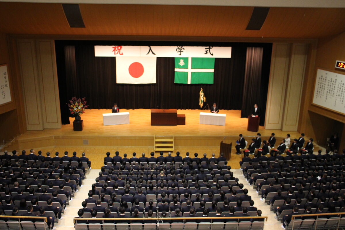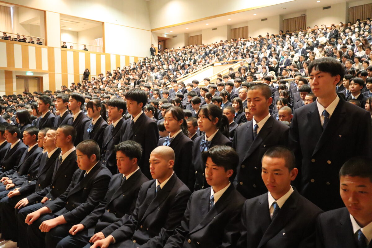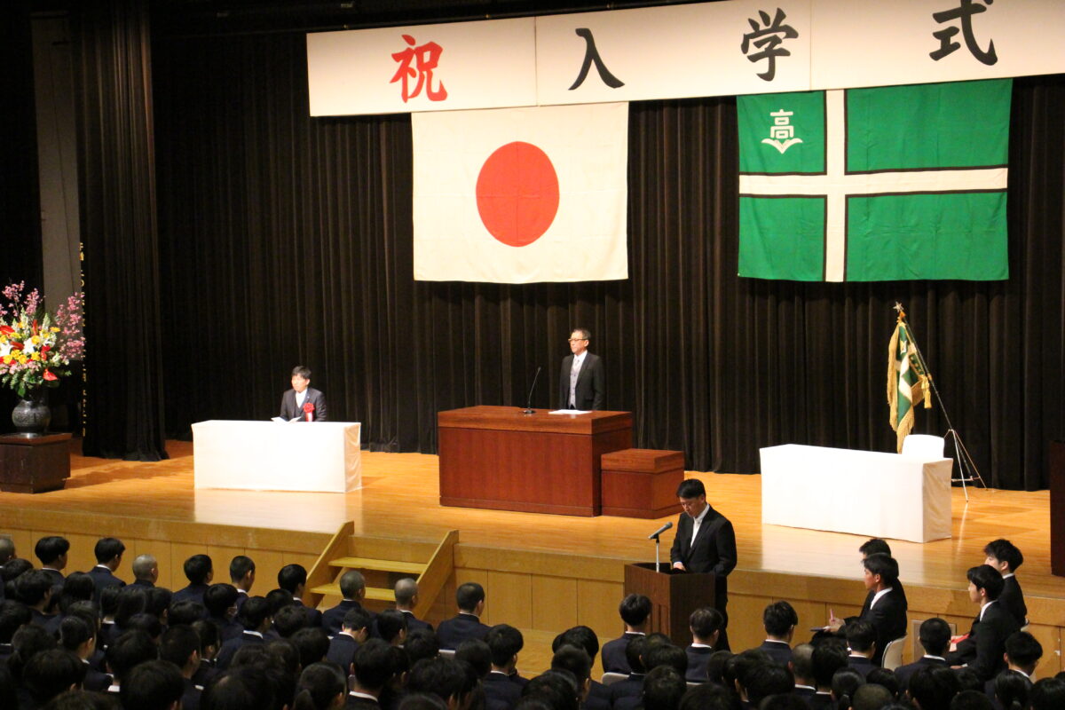 今年度は358名の新入生を迎え、会場は新たな一歩を踏み出す生徒たちの希望に満ちた空気に包まれていました。入学許可の場面では、各クラス担任の呼名に対し、一人ひとりがしっかりと返事をして起立する姿が見られ、これからの活躍への期待が一層高まりました。