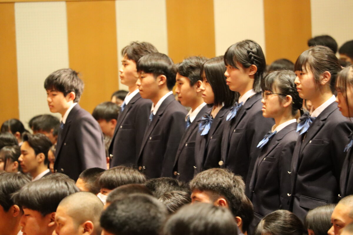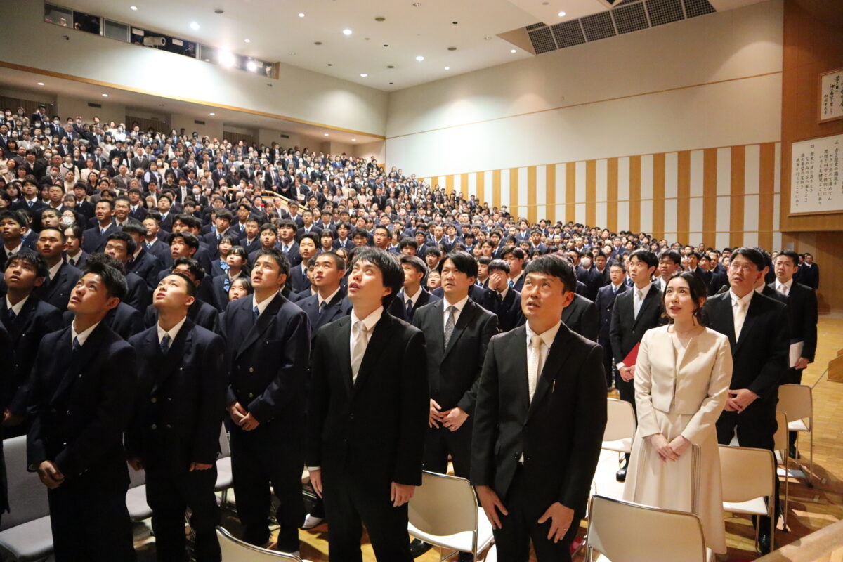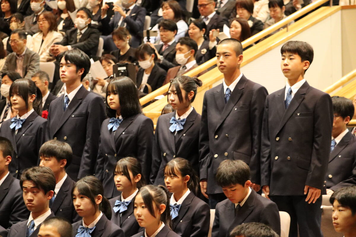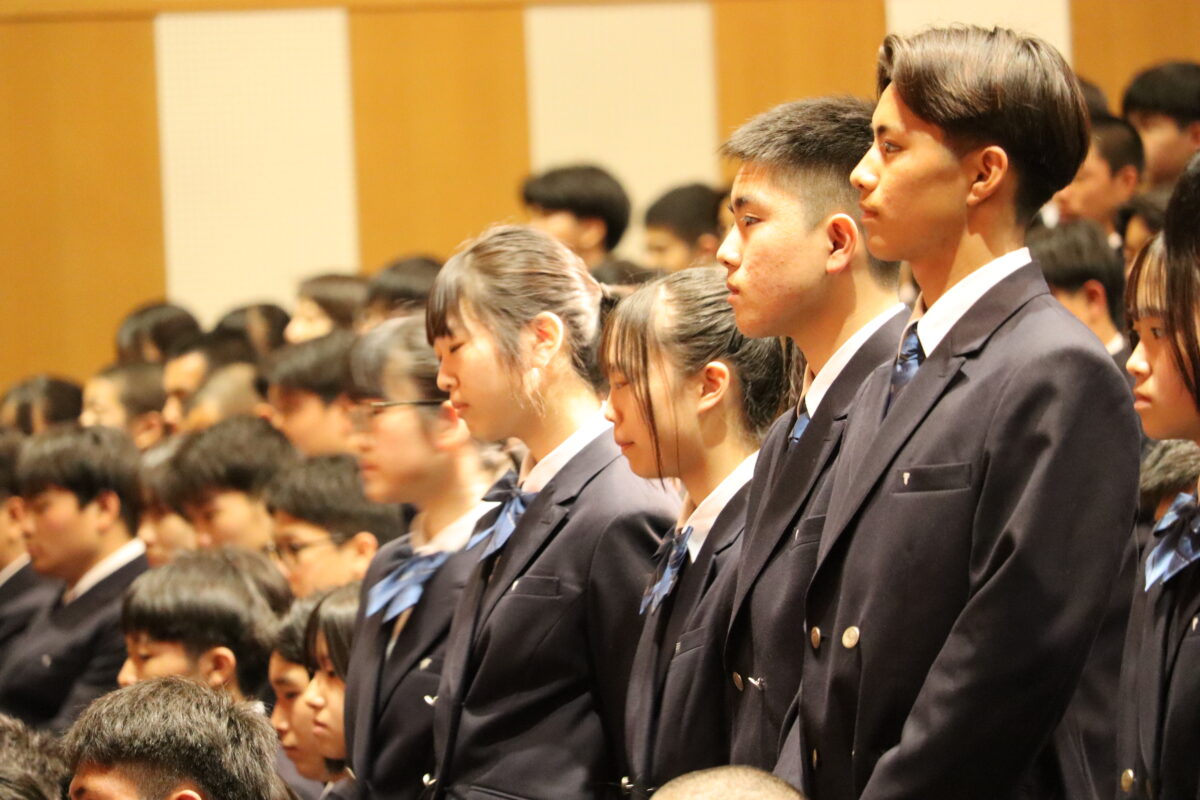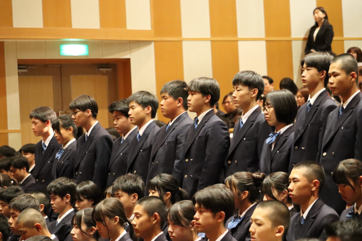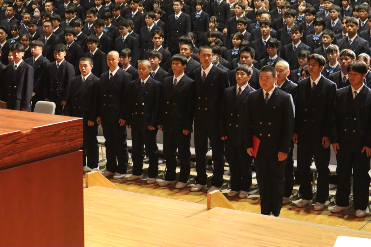 今年度は358名の新入生を迎え、会場は新たな一歩を踏み出す生徒たちの希望に満ちた空気に包まれていました。入学許可の場面では、各クラス担任の呼名に対し、一人ひとりがしっかりと返事をして起立する姿が見られ、これからの活躍への期待が一層高まりました。