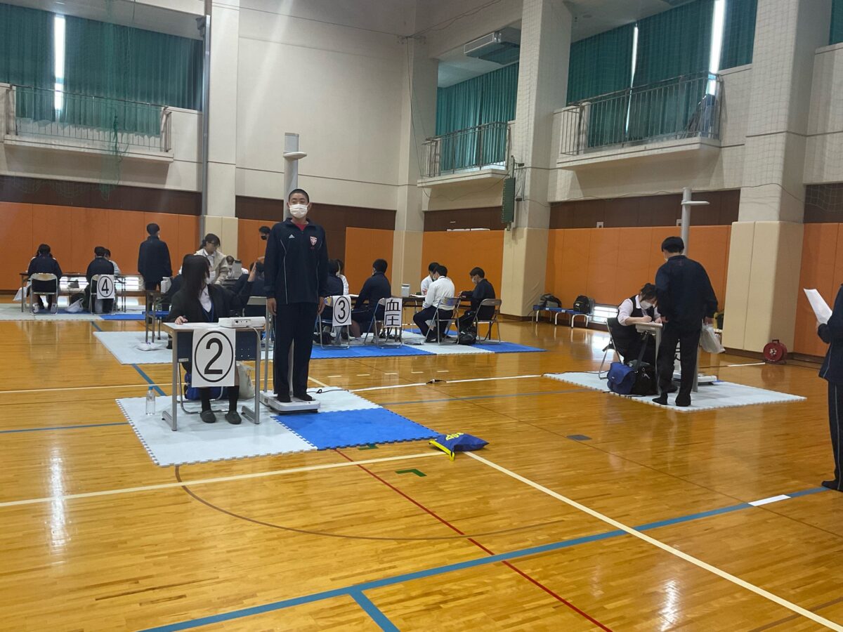 健康診断は体育館で行われ、クラスごとに順番に移動しながら、さまざまな検査項目に取り組んでいました。生徒たちは互いに声をかけ合いながらスムーズに受診し、落ち着いた様子で行動している姿が印象的でした。中でも身長測定では、「昨年より〇センチ伸びた」などと友人同士で楽しそうに話す場面も見られ、新しい環境の中でも自然と笑顔が広がっていました。