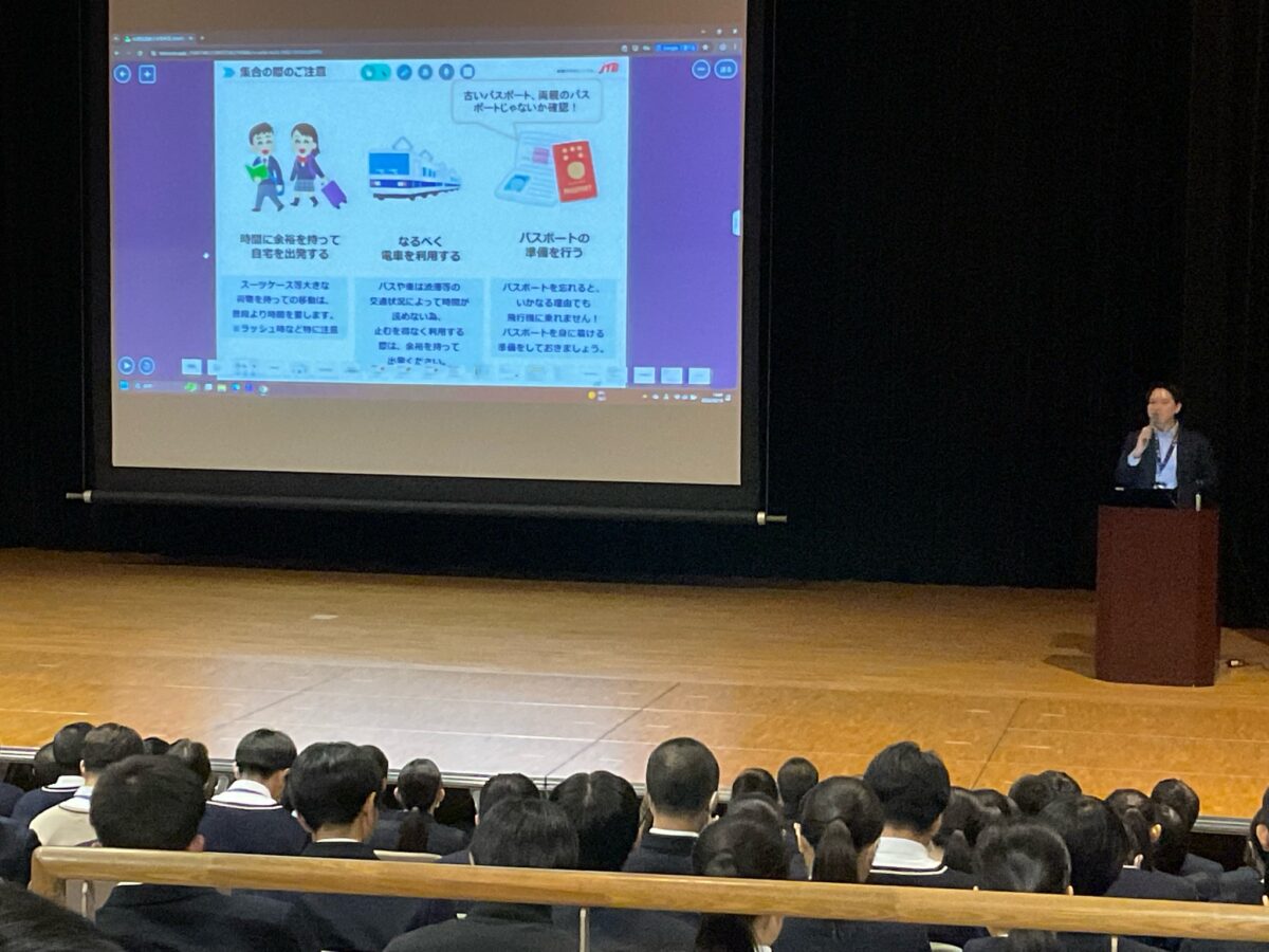 昨日は、講堂に集まり、研修旅行の結団式を行いました。結団式では、研修旅行に向けての注意事項など、学年主任やJTBの方々から詳細な説明がありました。その後、各コースに分かれて、行程や持ち物の最終確認、各コースでの注意点について確認を行いました。