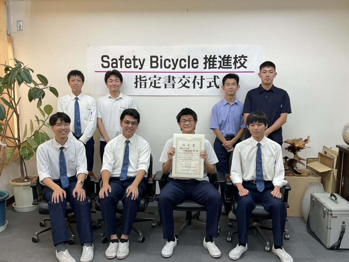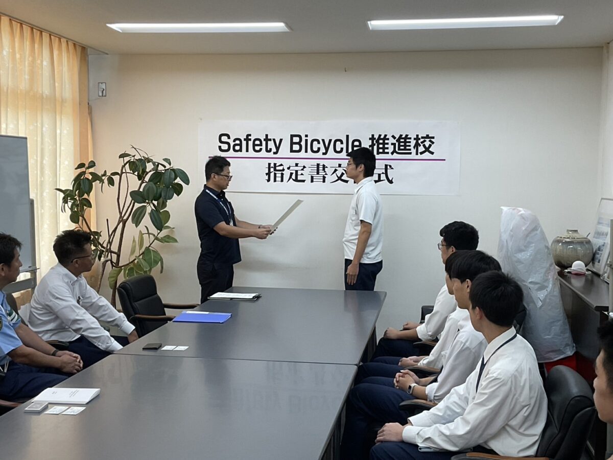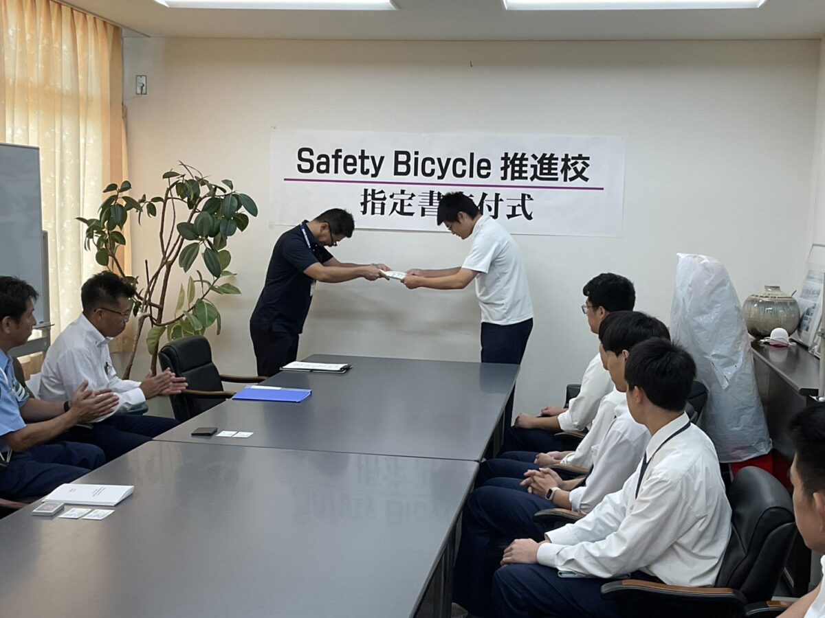 本日、本校に府教育委員会、府警本部交通部交通総務課自転車対策室、枚方警察交通課の皆さまがお越しくださり、『Safety Bicycle推進校』の指定書を交付していただきました。