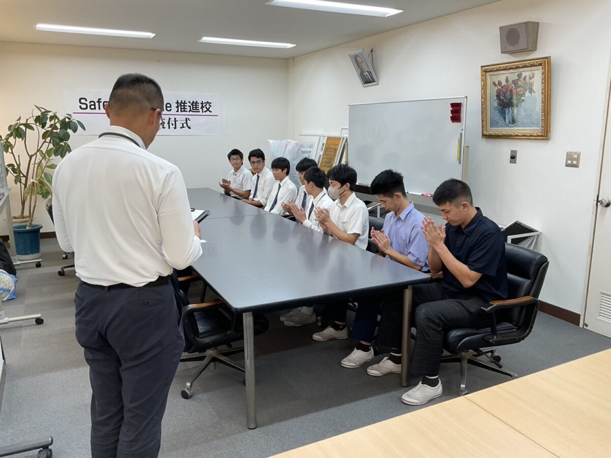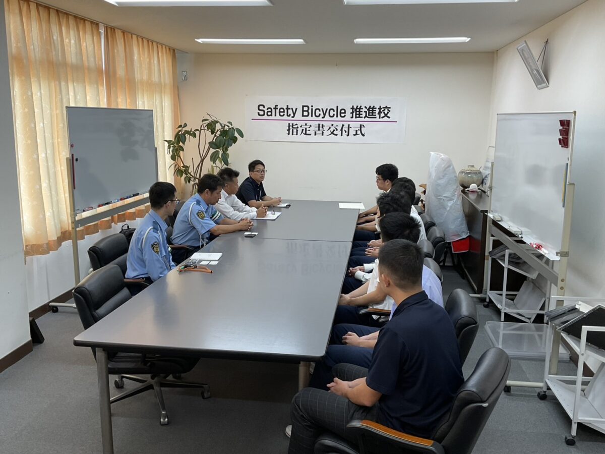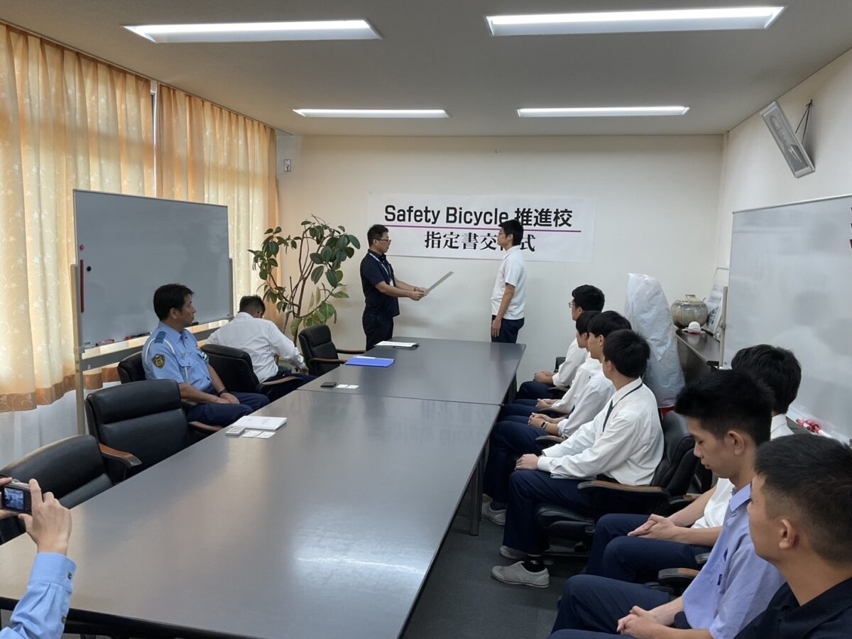 本日、本校に府教育委員会、府警本部交通部交通総務課自転車対策室、枚方警察交通課の皆さまがお越しくださり、『Safety Bicycle推進校』の指定書を交付していただきました。
