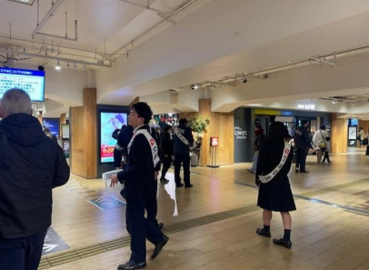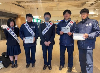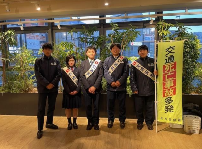セーフティバイシクル推進校とは、大阪府警と教育庁が連携し、「高校生自らが自転車の安全利用を『考え、学び、行動する』プロジェクト」の指定校となっており、本校も参加しています。自転車事故死傷者数が多い現状を踏まえ、交通安全意識の向上とルール・マナーの改善を図ることを目的としています。その活動の一環として、1月23日(金)の夕方に枚方駅中央改札前で交通安全について呼びかける運動を枚方警察の方と本校生徒会役員が一緒になって実施しました。
