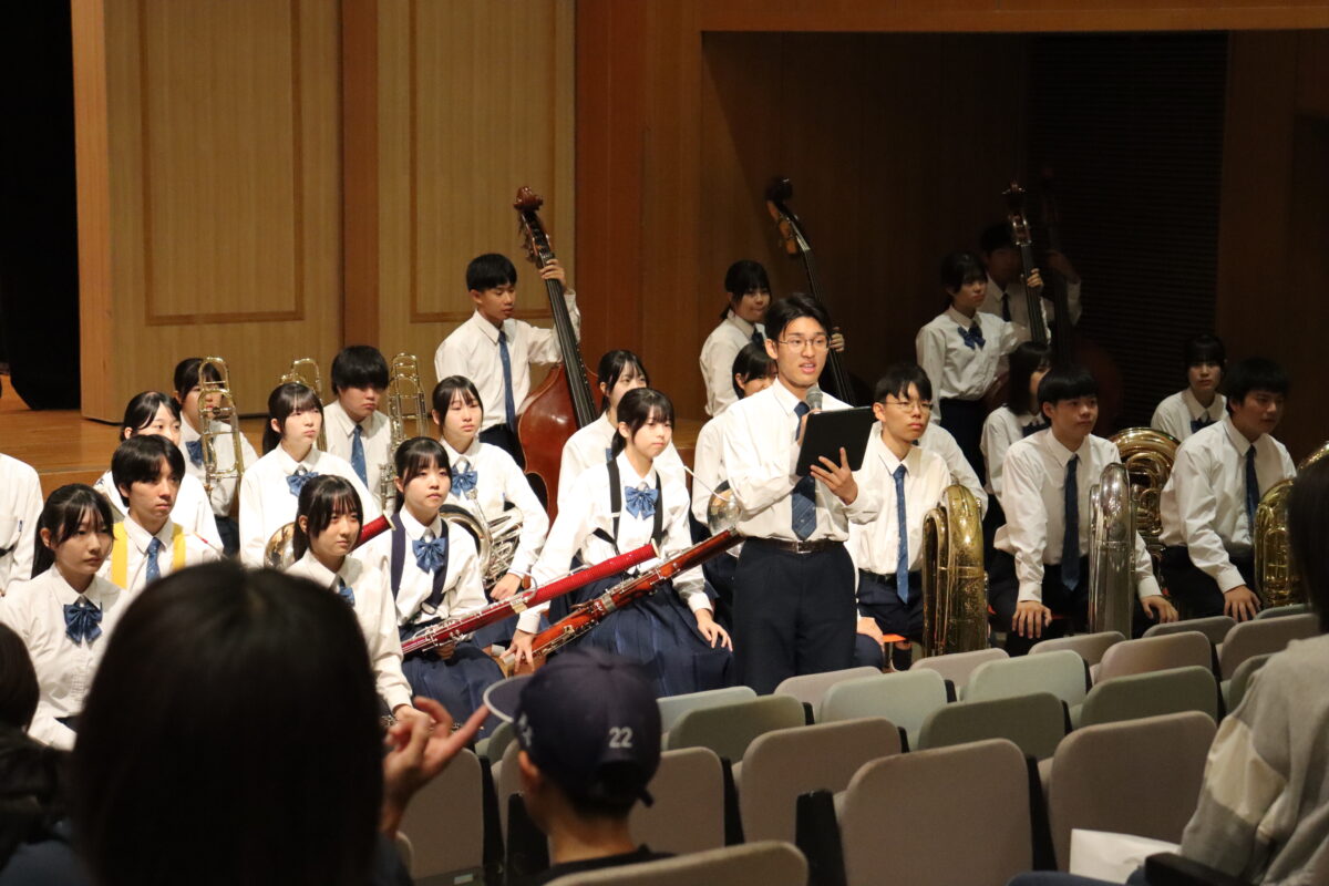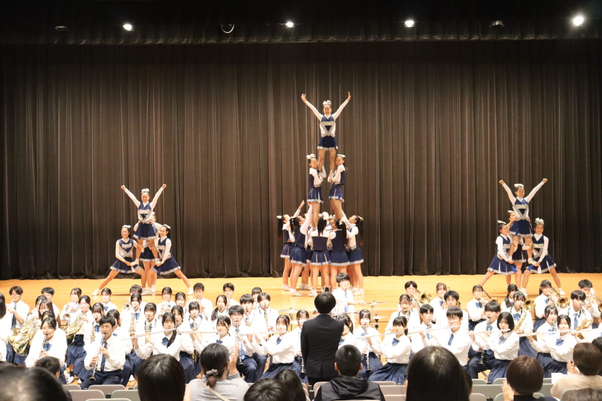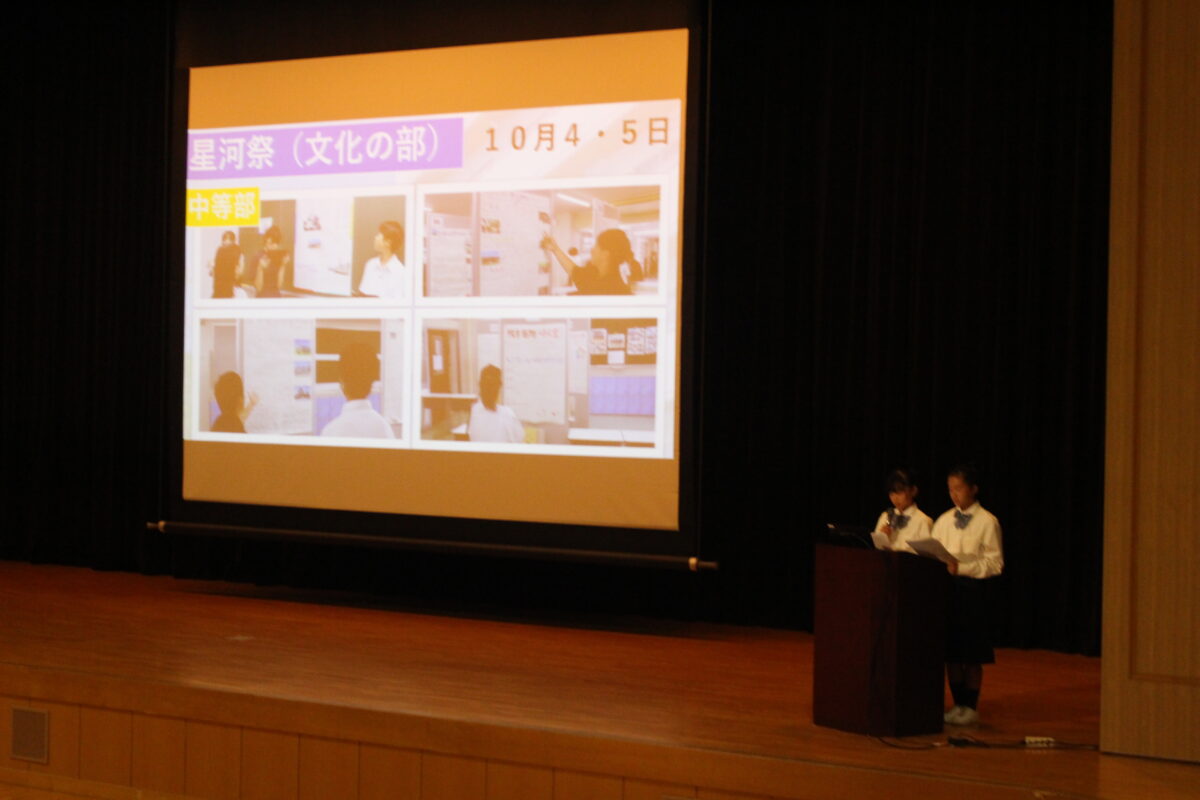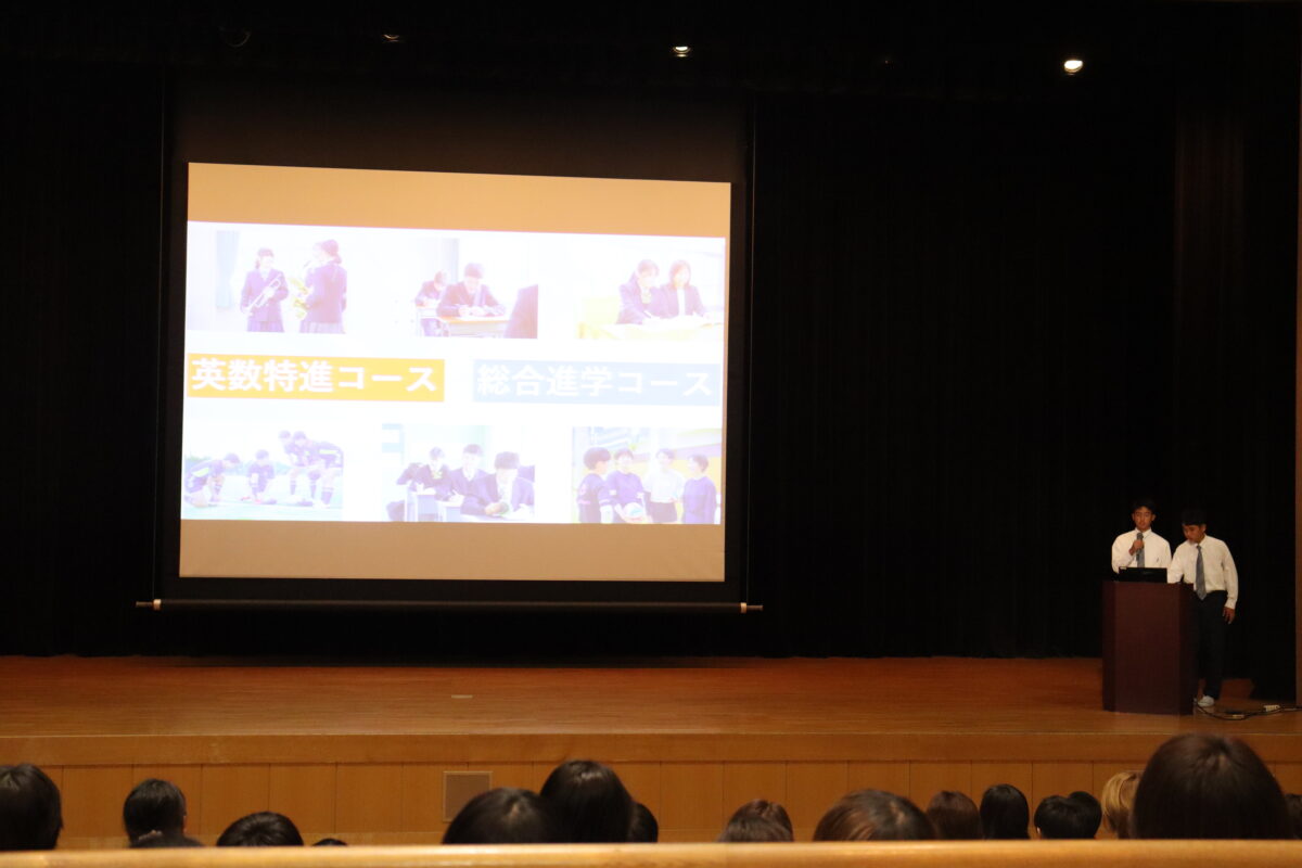 講堂での全体会のオープニングでは、本校の吹奏楽部とチアリーディング部が息の合った華やかなパフォーマンスを披露し、会場を盛り上げてくれました。その後は、中等部放送部員による司会進行のもと、生徒による学校紹介や行事紹介を行いました。