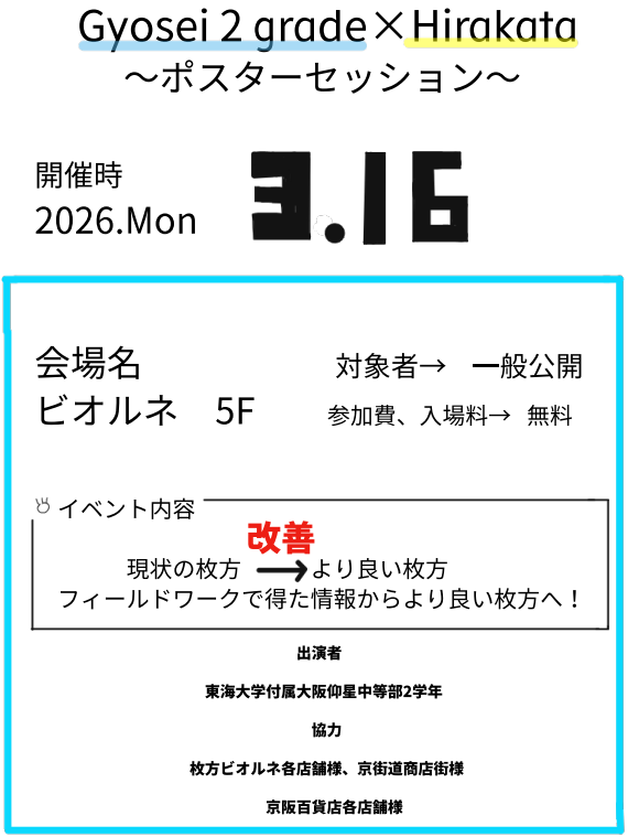 2年生は6月の研修旅行で熊本市内や東海大学阿蘇くまもと臨空キャンパスなどで SDGs に関する取り組みについて学び、11月には「枚方地域発展プロジェクト」と題し、今年も枚方ビオルネ、京阪百貨店、京街道枚方宿、枚方街づくり協議会などの地域のパートナーシップ企業・団体による協力のもと、SDGsをテーマとした課題解決プログラム「枚方フィールドワーク」を行ってきました。そして、来る3月16日(月)に枚方ビオルネで枚方地域発展のためのポスターセッション(発表会)を行います。どなたでもご覧になれますので、是非お越しください。