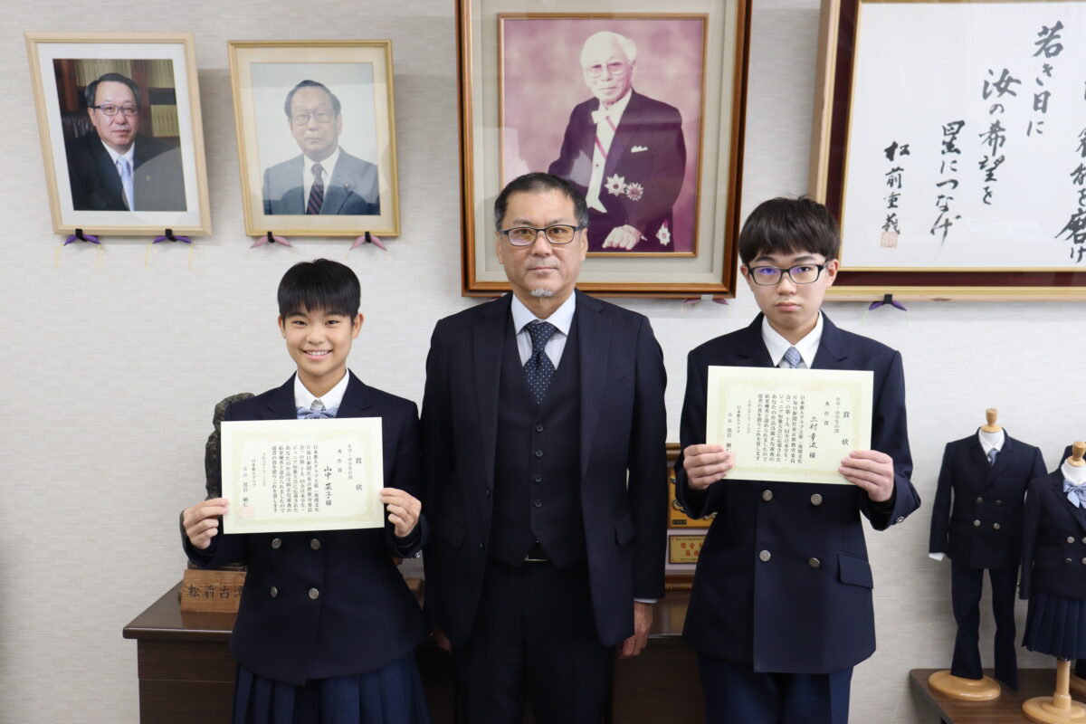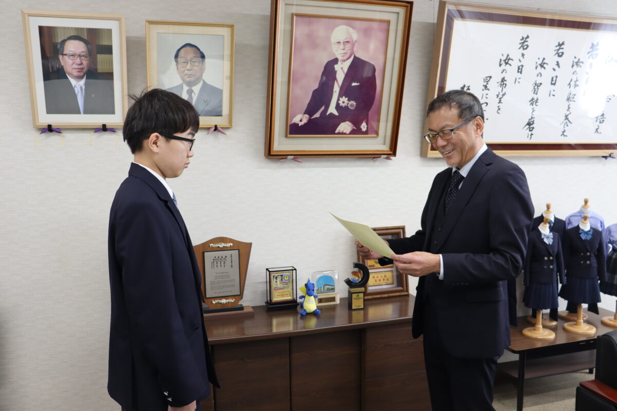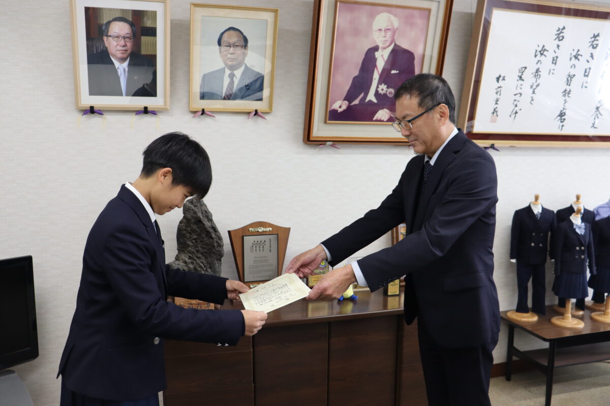 三村さんは10月25日(土)に東京・明治神宮で行われた表彰式に出席し、堂々と賞状を受け取りました。所用により出席できなかった山中さんも、本日校長室にて校長先生から賞状を授与されました。