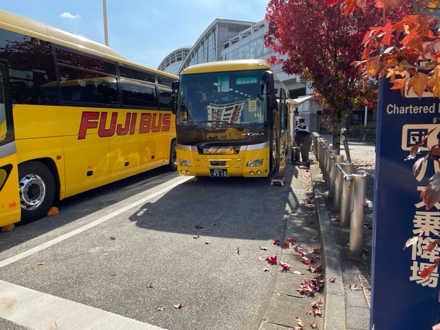 ③ 新八代駅に到着し、これから球磨川のラフティングに向けてバスに乗っています! 九州は良い天気で大変楽しみです!